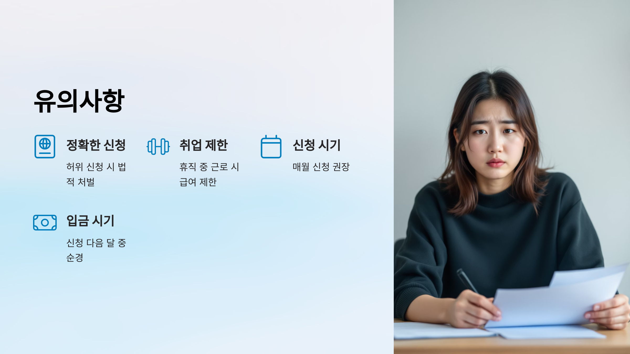 - 신청 내용의 정확성: 신청 내용이 사실과 다를 경우, 급여 지급이 중단될 뿐만 아니라, 지급받은 급여를 반환해야 하며 법적 처벌을 받을 수도 있습니다.