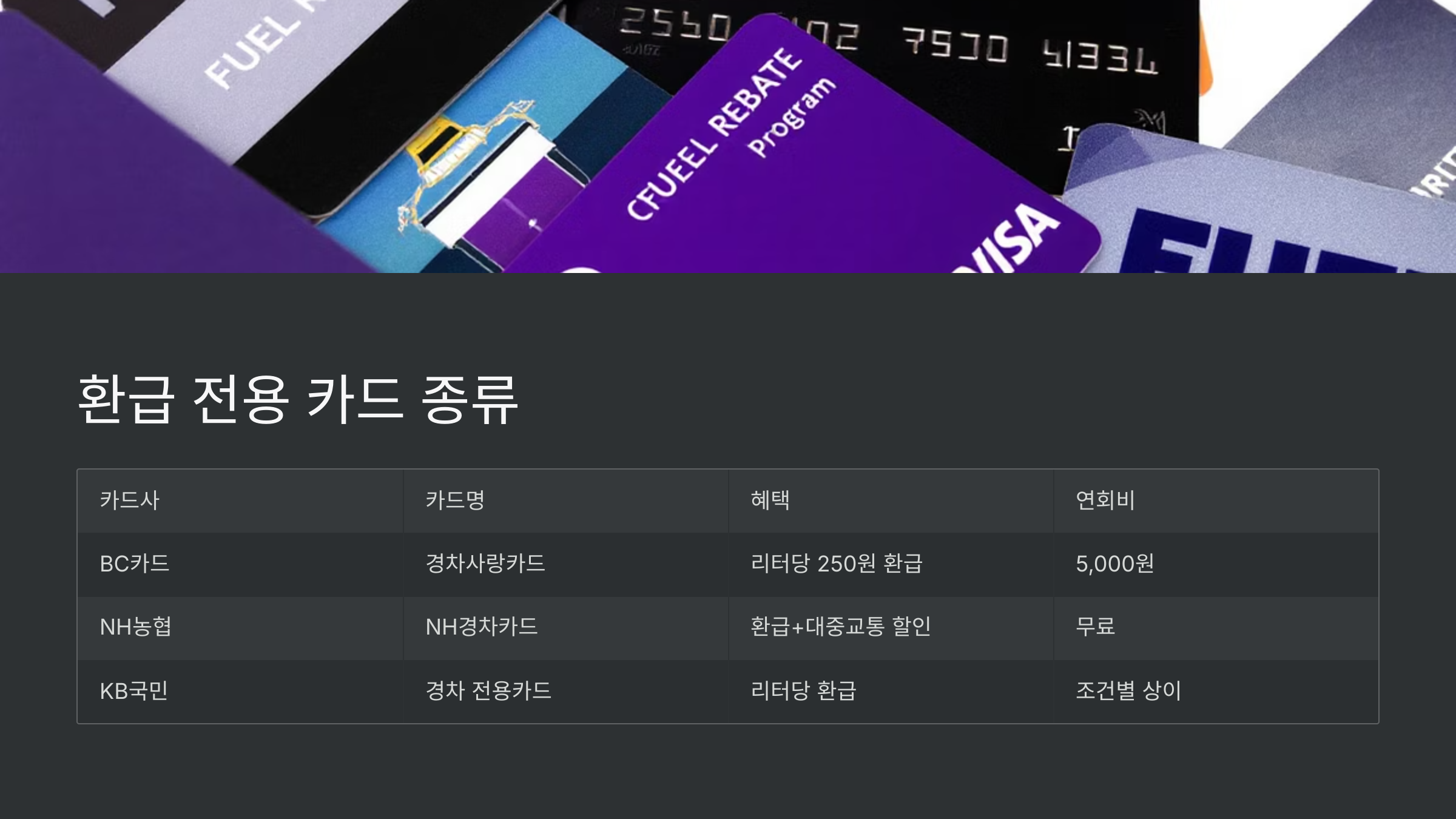 | BC카드 | 경차사랑카드 | 주유소 리터당 250원 환급 | ₩5,000 |