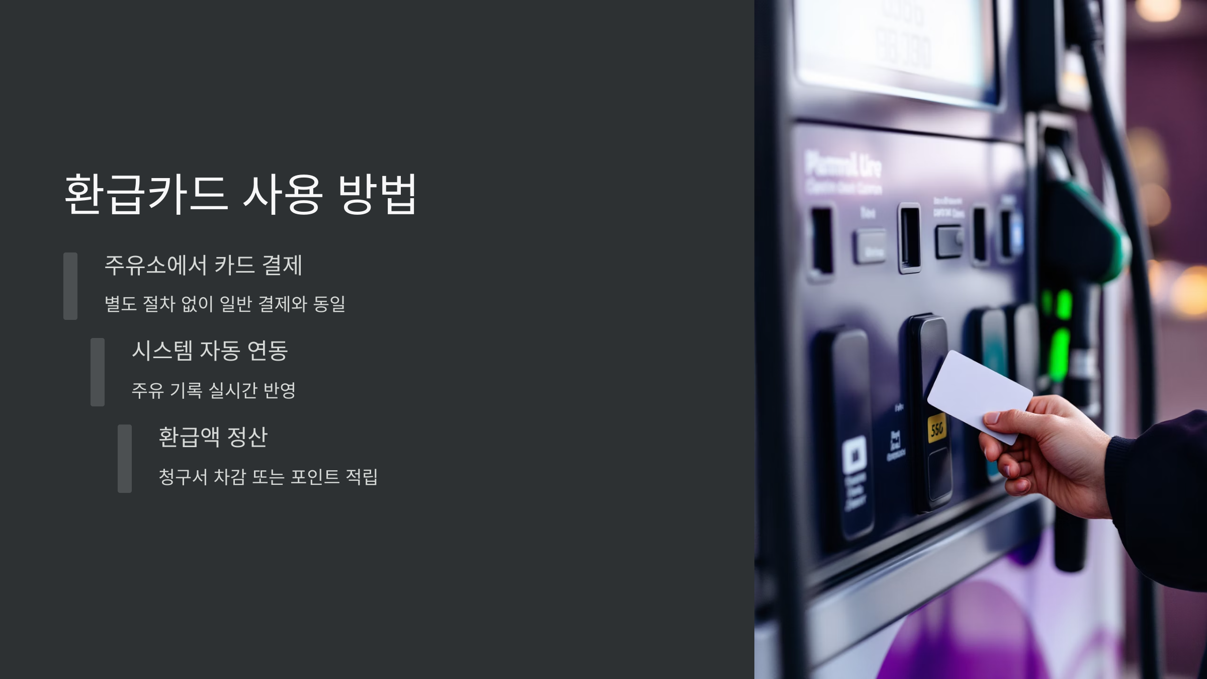 가장 큰 특징은 복잡한 신청서 없이 카드 한 장으로 모든 게 자동 처리된다는 점이에요. 지정된 전용카드로 결제한 주유 내역만큼 환급이 적용되며, 카드 청구서에서 차감되거나 포인트로 환급돼요.