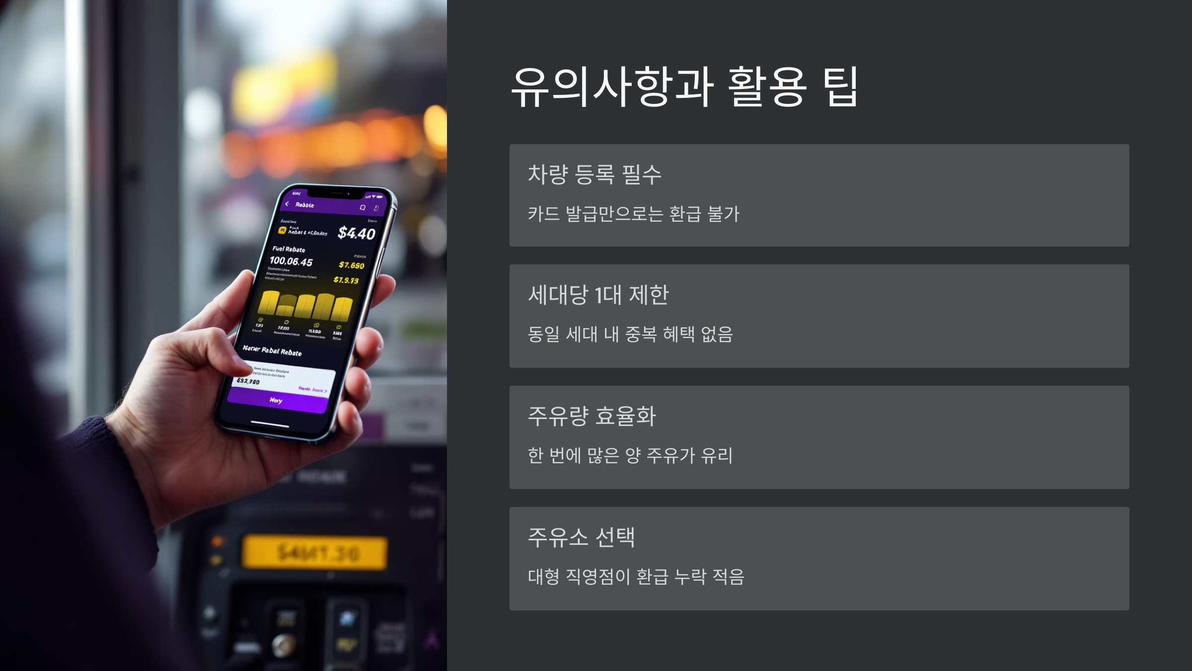 다만 모든 주유소에서 환급 적용이 되는 건 아니에요. 일부 무인 셀프주유소나 등록되지 않은 소형 주유소에서는 카드 인식이 되지 않아 혜택이 빠질 수도 있어요. 처음 가보는 곳이라면 주유 전에 "환급카드 되나요?" 하고 꼭 물어보는 게 좋아요.