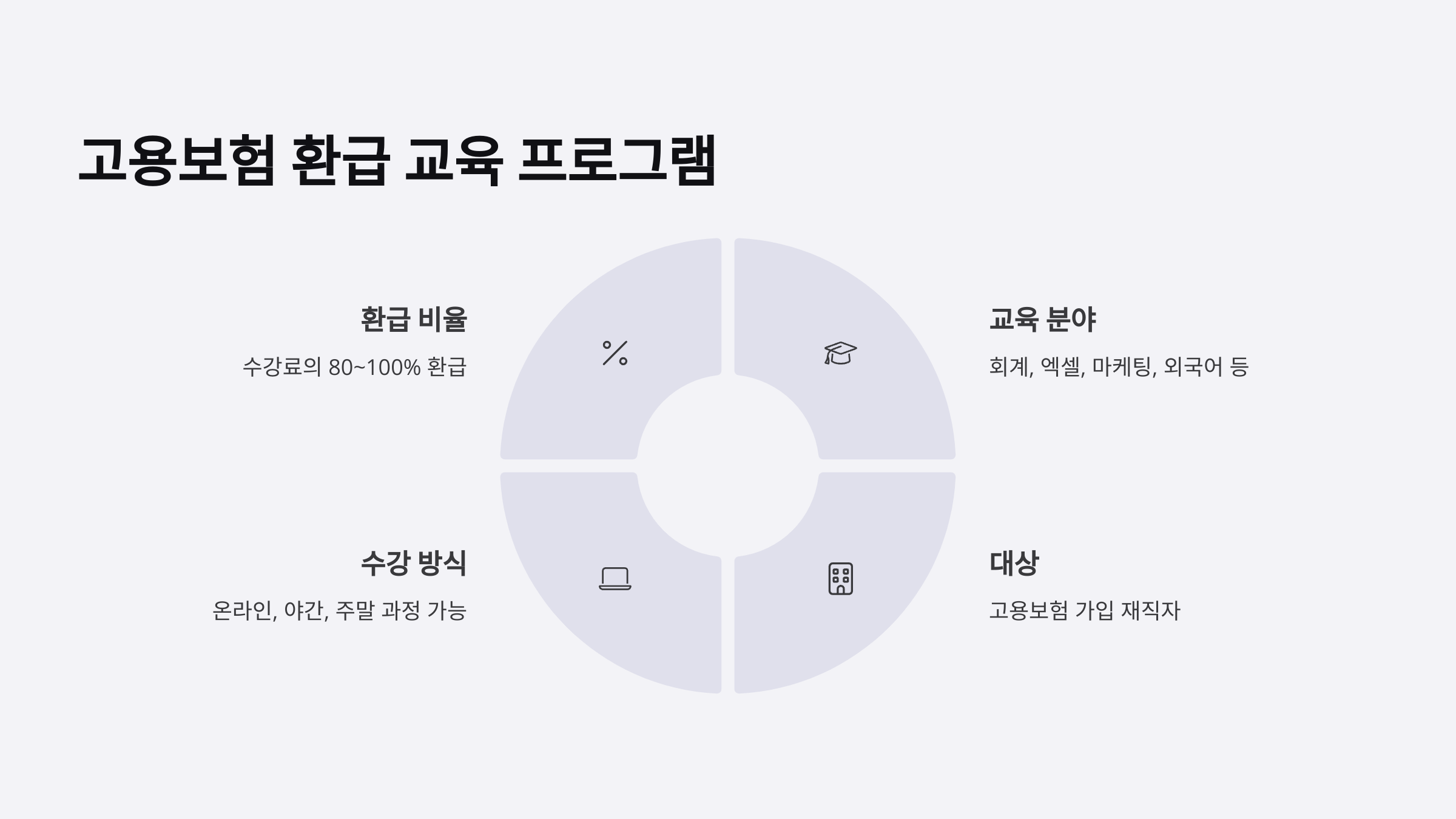 특히 사내 직무 교육 외에도 **자기계발용 야간 강의, 온라인 과정도 환급 대상**이니 📌 재직 중이라면 꼭 교육기관에 “고용보험 환급 과정인가요?” 물어보세요!