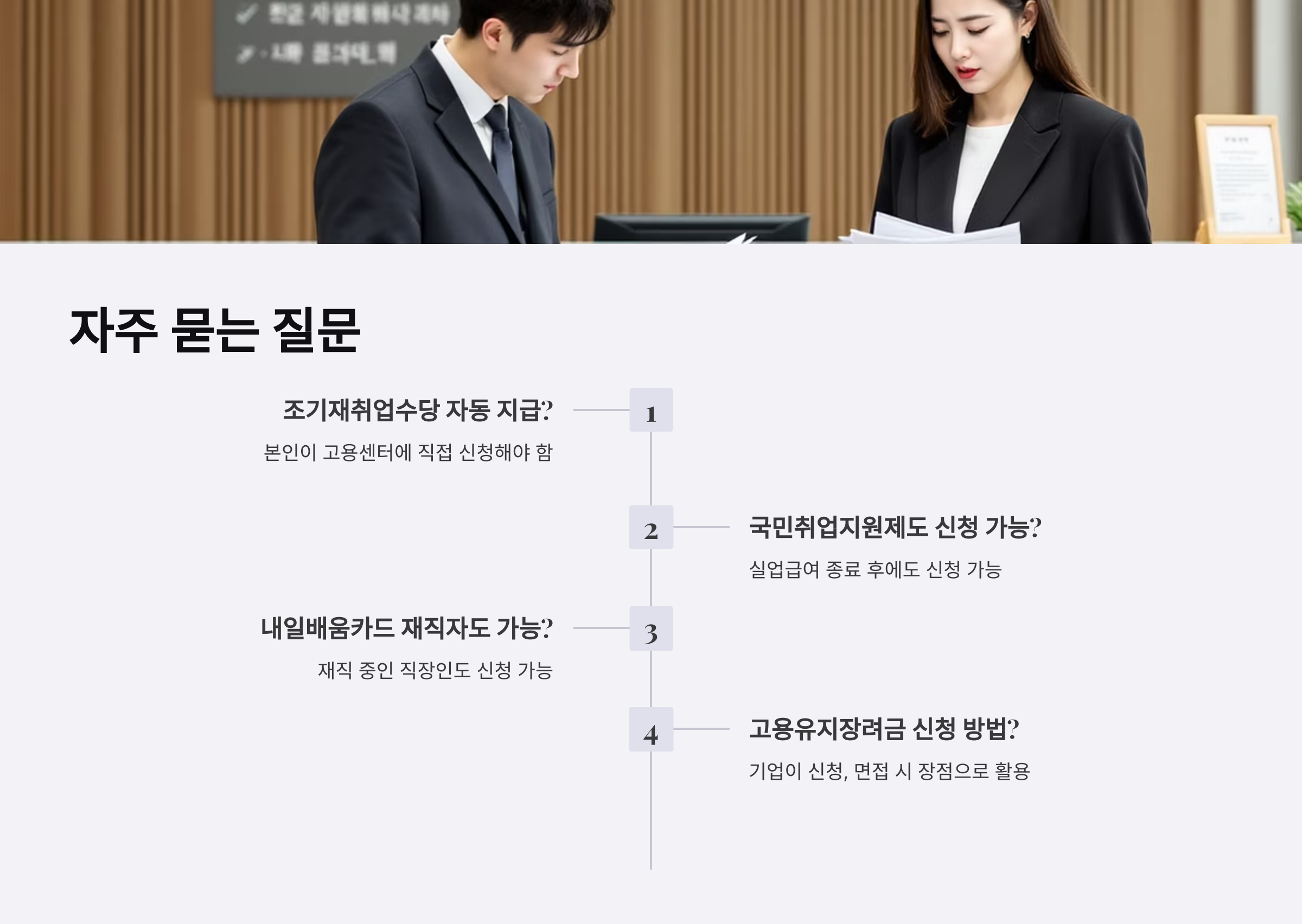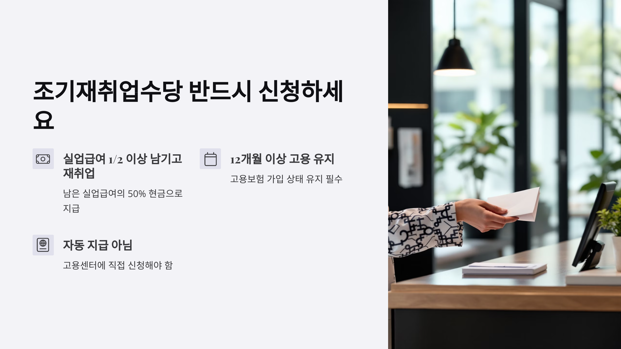 주의할 점은, 반드시 **재취업 후 12개월간 고용보험에 가입되어 있어야** 하고, **고용센터에 신청해야만 받을 수 있다는 것**이에요. 자동 지급이 아니니 꼭 챙기세요!