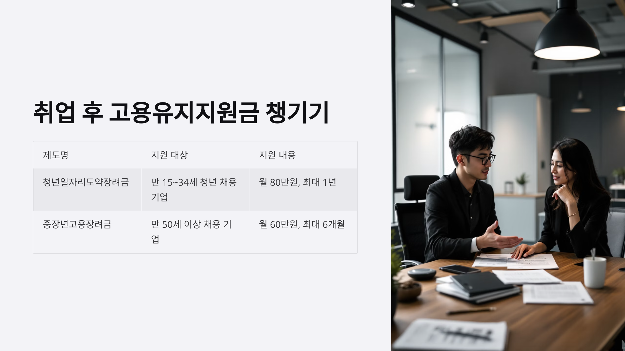 특히 청년일자리도약장려금, 중장년고용장려금 등은 구직자 입장에서 사전 정보만 알고 있어도 면접 시 어필이 가능해요. “저는 실업급여 수급자 출신이라 고용유지지원금 대상입니다”라고 말하면 기업 입장에서 **월 수십만 원 혜택을 받을 수 있기 때문에 선호도가 높아져요!**