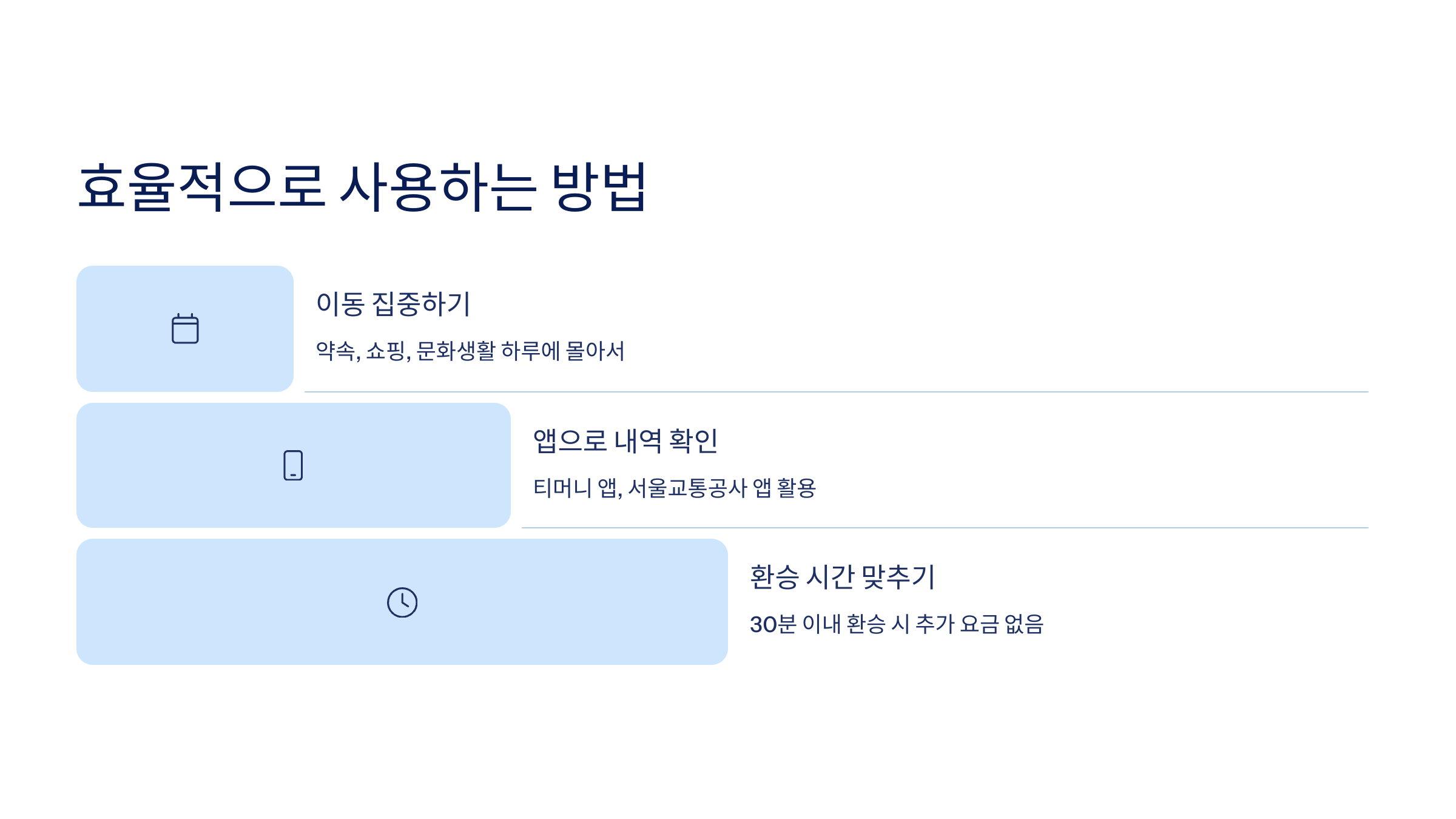 세 번째는 환승할 때 시간 간격을 잘 맞추는 거예요. 30분 이내 환승 시 추가 요금 없이 이어서 탈 수 있기 때문에 요금을 더 아낄 수 있어요.