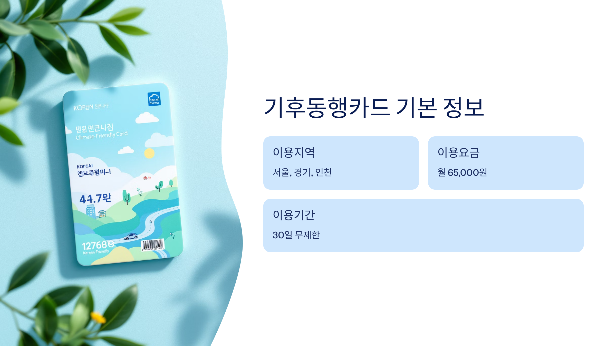 기후동행카드는 수도권 지역에서 대중교통을 무제한으로 이용할 수 있는 월 정액 교통카드입니다. 교통비 절약은 물론, 탄소배출을 줄여 친환경 이동을 촉진하는 취지로 만들어졌어요.