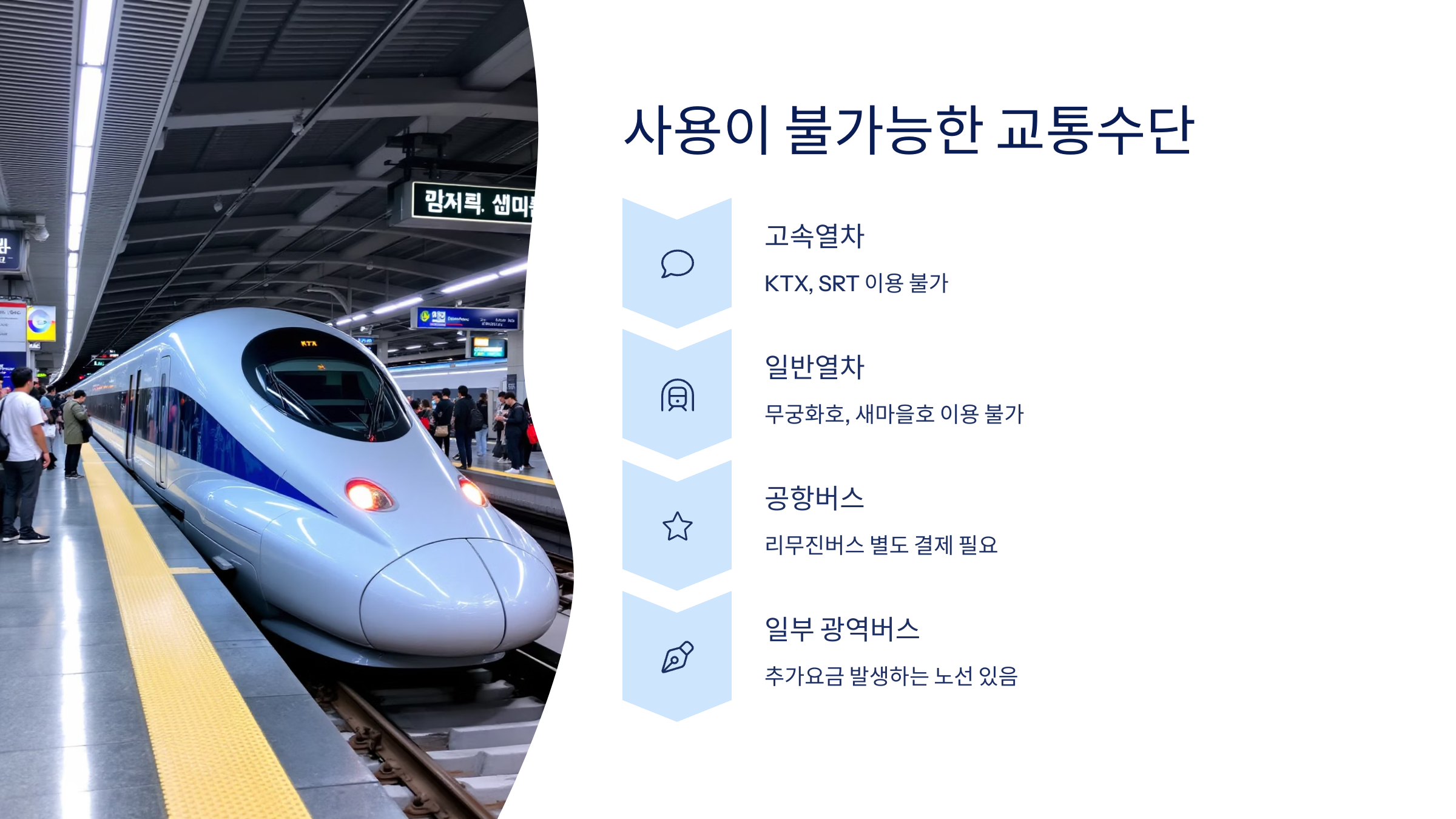 단, 코레일 일반열차(KTX, 무궁화호, 새마을호)는 사용할 수 없어요. 일반철도 노선 이용 시 주의해야 합니다.