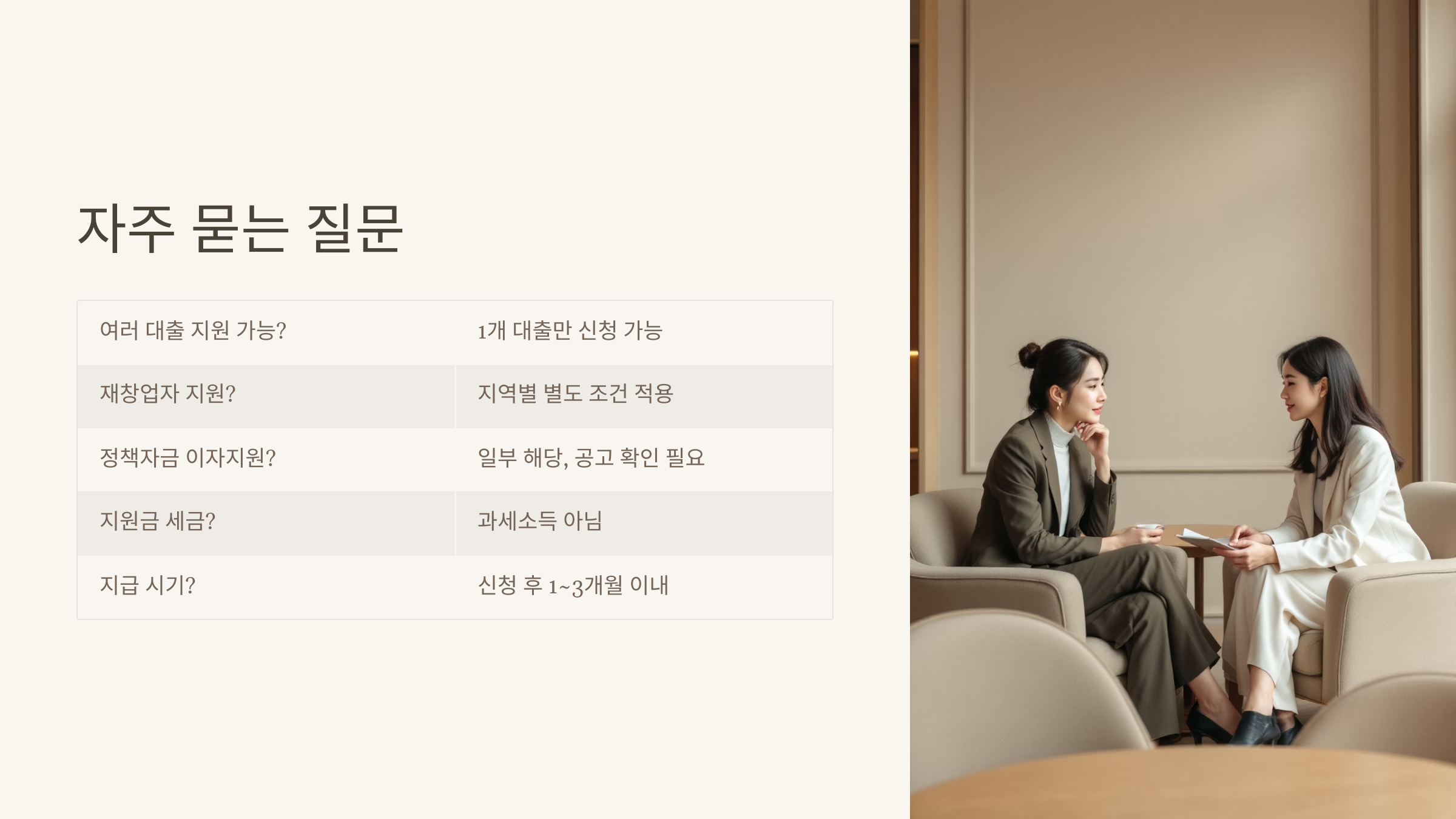 또한 일부 지역은 정책자금 또는 신용보증재단 대출에 한정해 이자 지원을 하기도 하며, **개업 1년 미만, 폐업 후 재창업자의 경우 별도 조건이 적용**돼요.