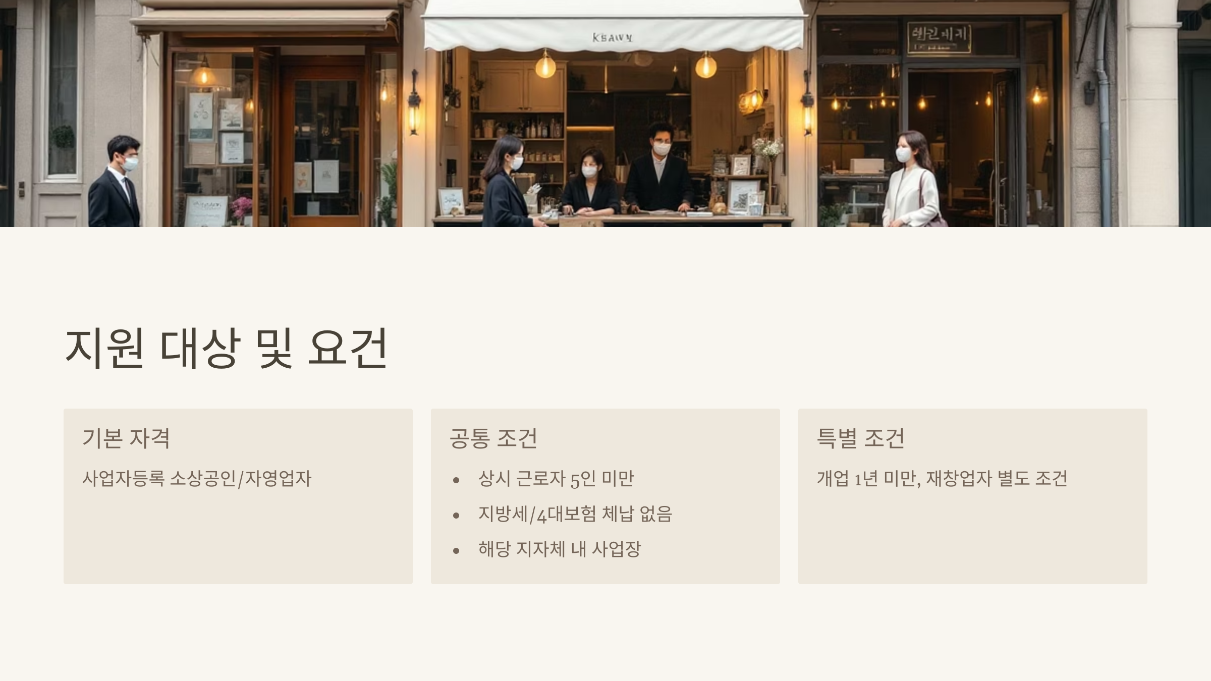 다만 지역에 따라 추가 조건이 붙는 경우가 많고, 지원 대상 업종, 연매출 기준, 사업장 소재지 등에서 제한이 생길 수 있어요.