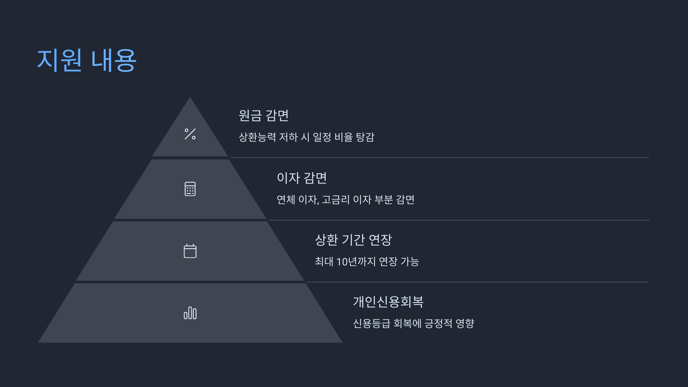 두 번째는 이자 감면이에요. 기존 대출에 부과된 연체 이자나 고금리 이자 부분을 낮춰서 상환 부담을 줄여줍니다. 특히 장기 연체자에게 유리해요.