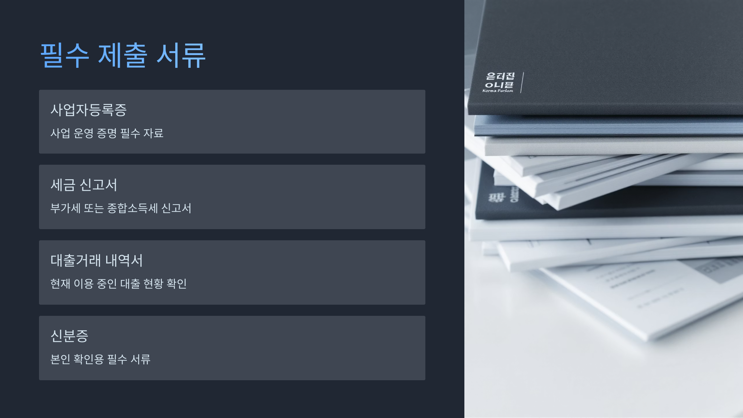 두 번째는 최근 1년간의 부가세 신고서 또는 종합소득세 신고서입니다. 소득이나 매출 감소를 입증하는 데 사용돼요.