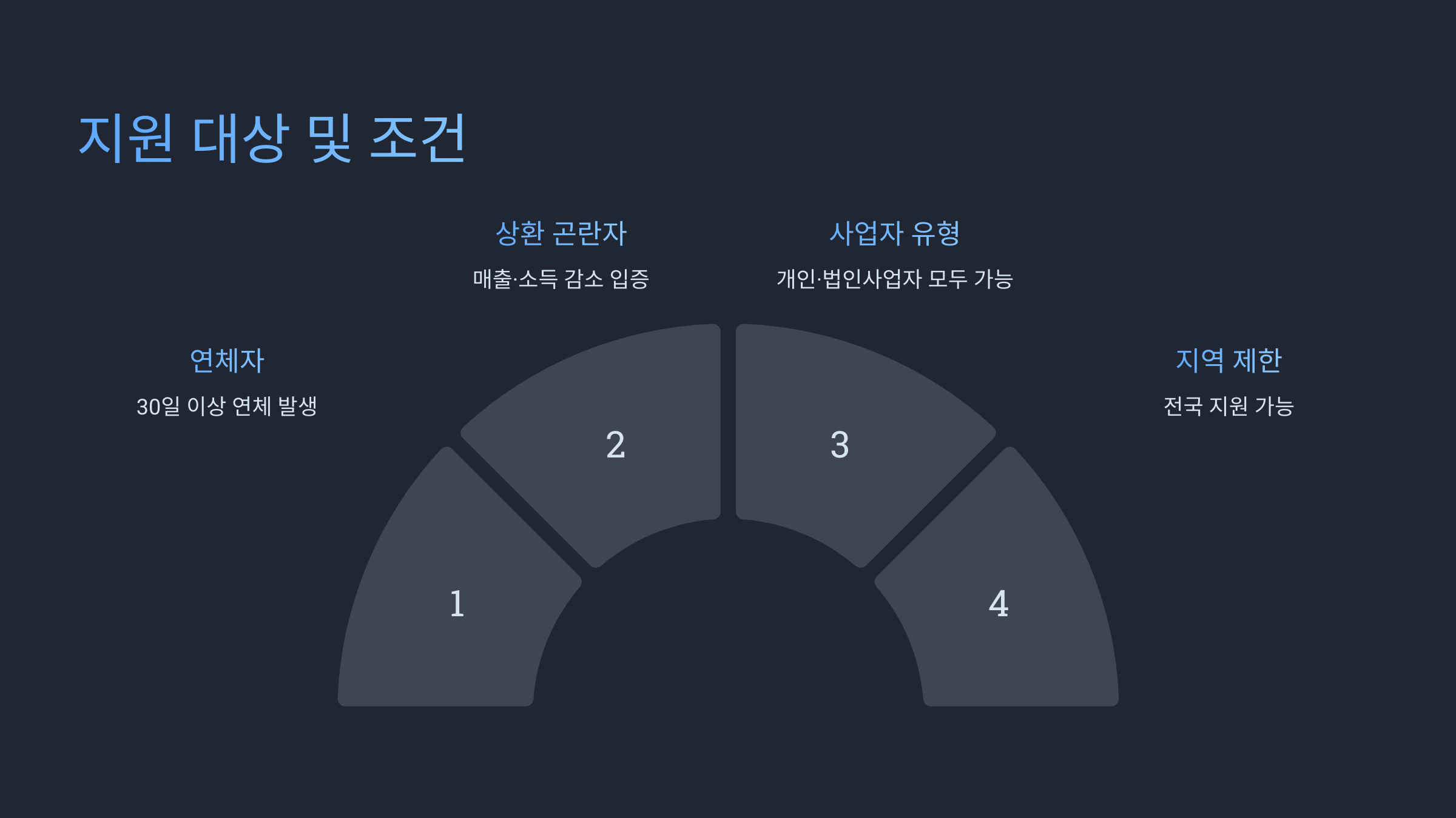 또한, 연체가 없더라도 매출 감소율, 소득 감소율이 일정 기준 이상이면 지원 대상에 포함될 수 있어요. 객관적인 자료로 매출 감소를 입증할 수 있어야 합니다.