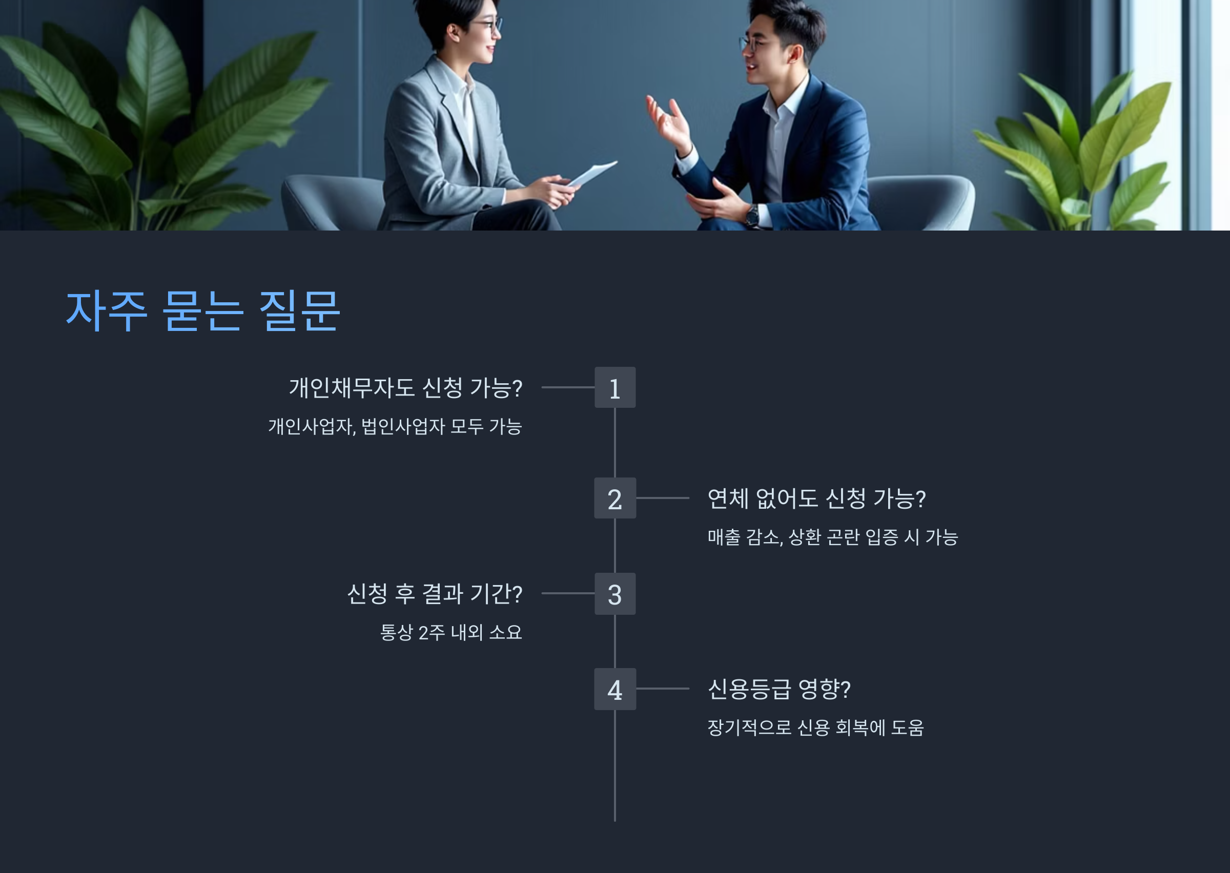 이 제도는 신용회복과 부채감면을 동시에 지원하기 때문에, 과거 채무불이행이나 연체 이력이 있어도 상담 후 적합하다고 판단되면 신청할 수 있어요.