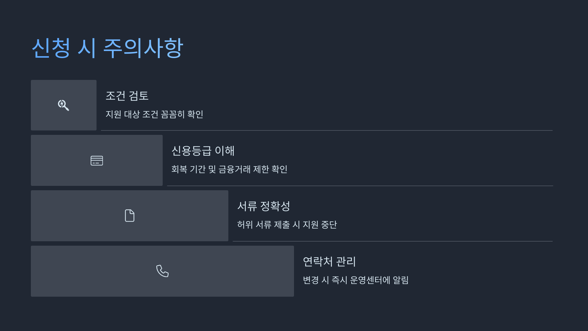 지원 기본 조건은 금융권 대출을 이용 중이며, 일정 기간 이상 연체 중이거나 상환 곤란 사유가 확인된 경우입니다. 연체 기간은 최소 30일 이상이어야 하고, 또는 상환 능력이 감소한 사실을 입증해야 해요.