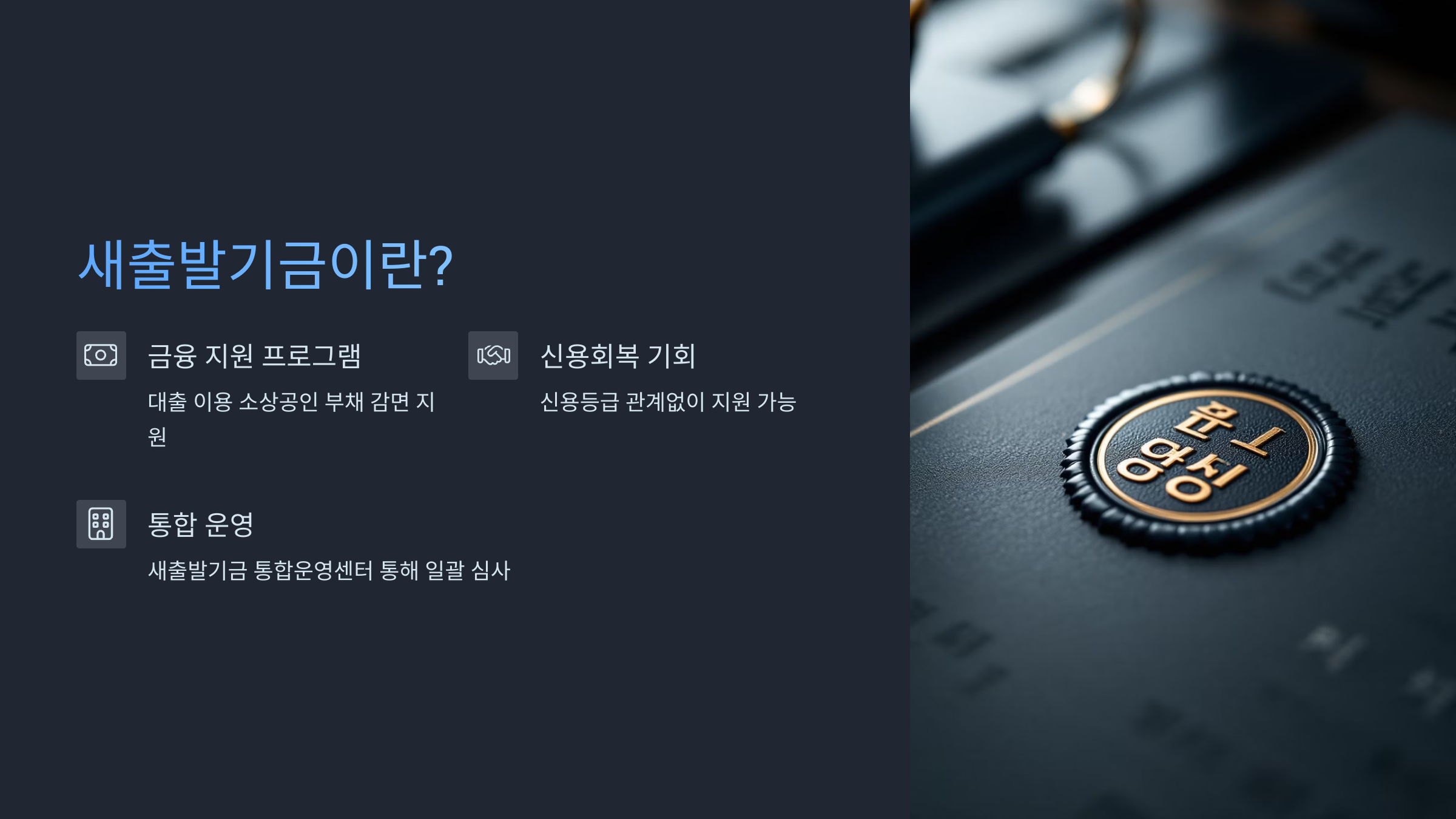 새출발기금은 부채 조정, 상환 유예, 이자 감면 등의 다양한 방식을 통해 채무자의 부담을 줄여주는 역할을 해요. 특히 기존 신용등급에 관계없이 지원받을 수 있어 재기의 기회를 넓히는 데 큰 도움이 됩니다.