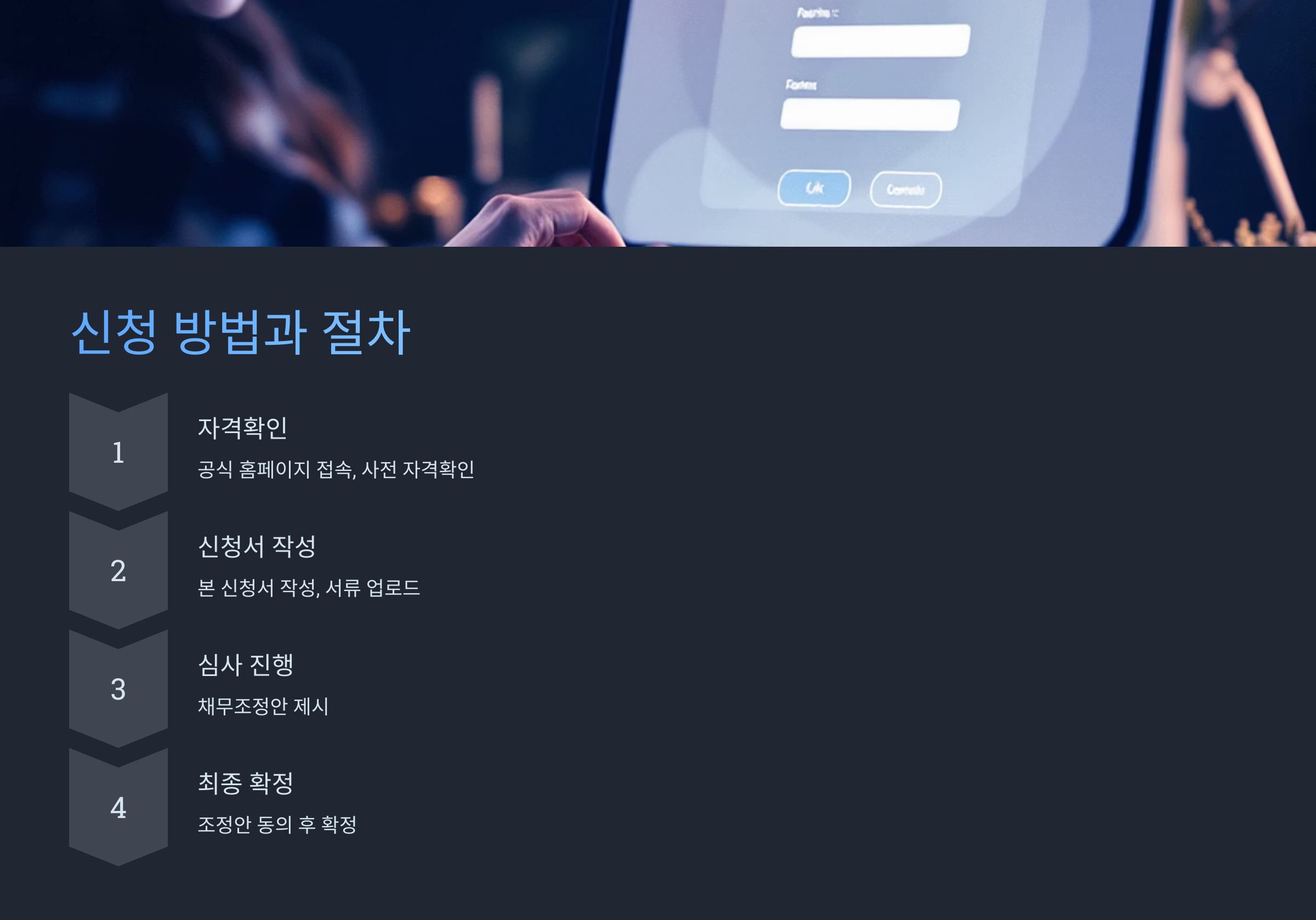 자격 확인이 완료되면 본 신청서를 작성하고, 필요한 서류를 업로드해야 합니다. 이후 심사가 진행되고, 심사 결과에 따라 채무조정안이 제시돼요. 이 안에 동의하면 최종 확정됩니다.