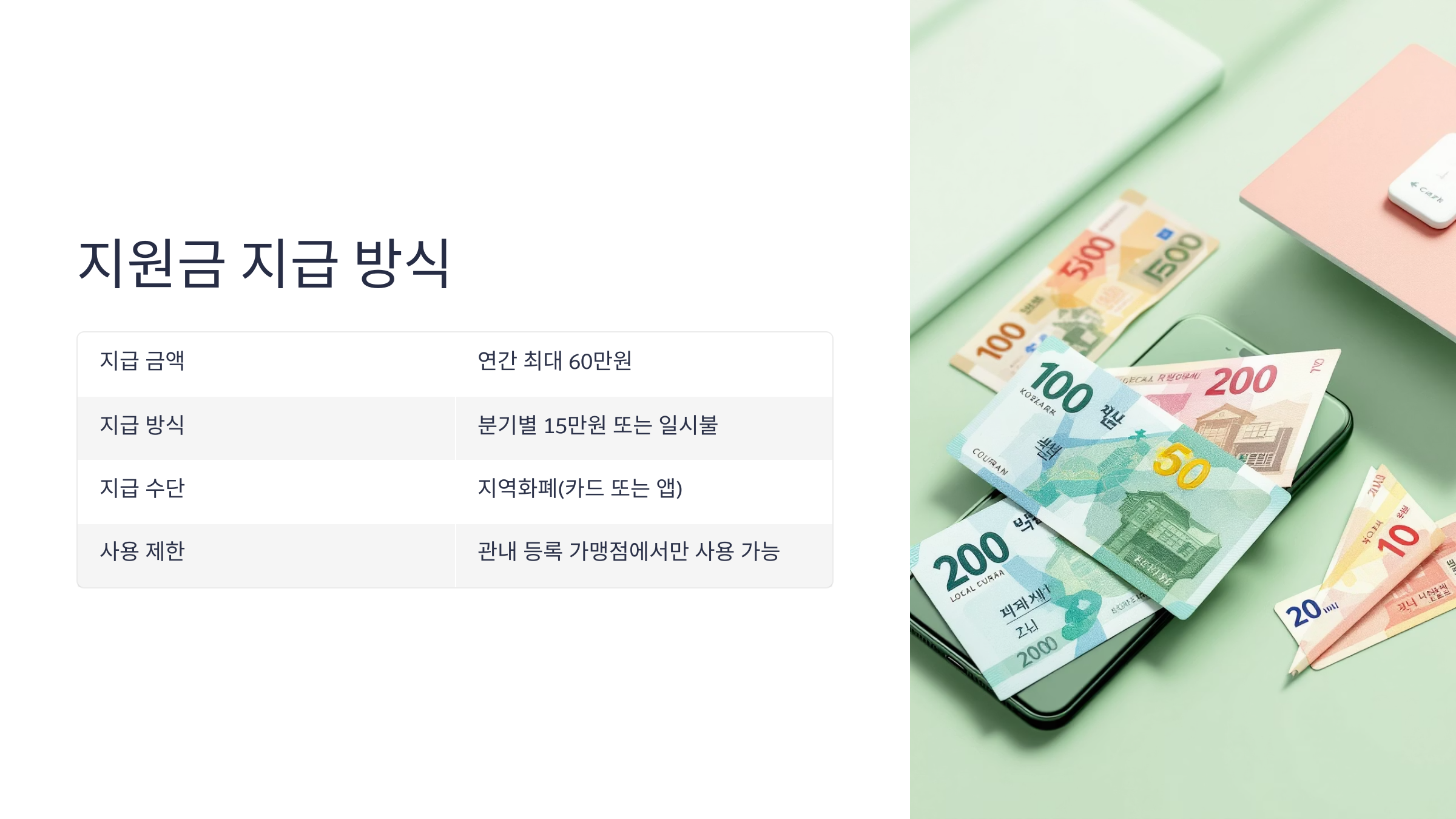| 여주 | 분기별 | 15만 원 × 4회 | 여주사랑카드 |
