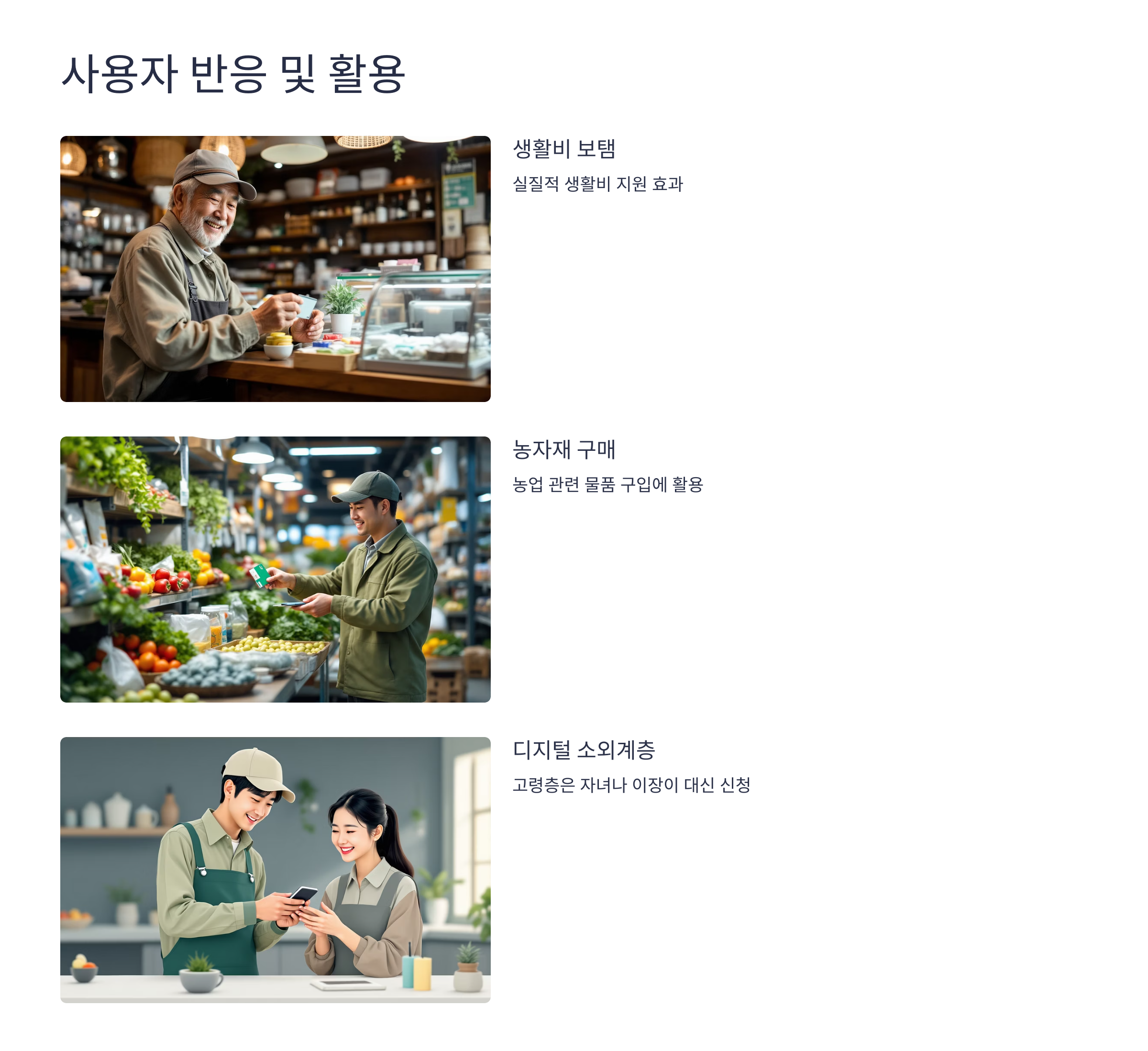 실제 농민기본소득을 받아본 사람들 중 대부분은 “지역화폐 사용이 번거롭지 않고, 실질적 생활비 보탬이 된다”는 반응을 보이고 있어요. 특히 농자재, 식료품, 연료 구매 등에 사용할 수 있어서 현금처럼 유용하게 활용되고 있죠.