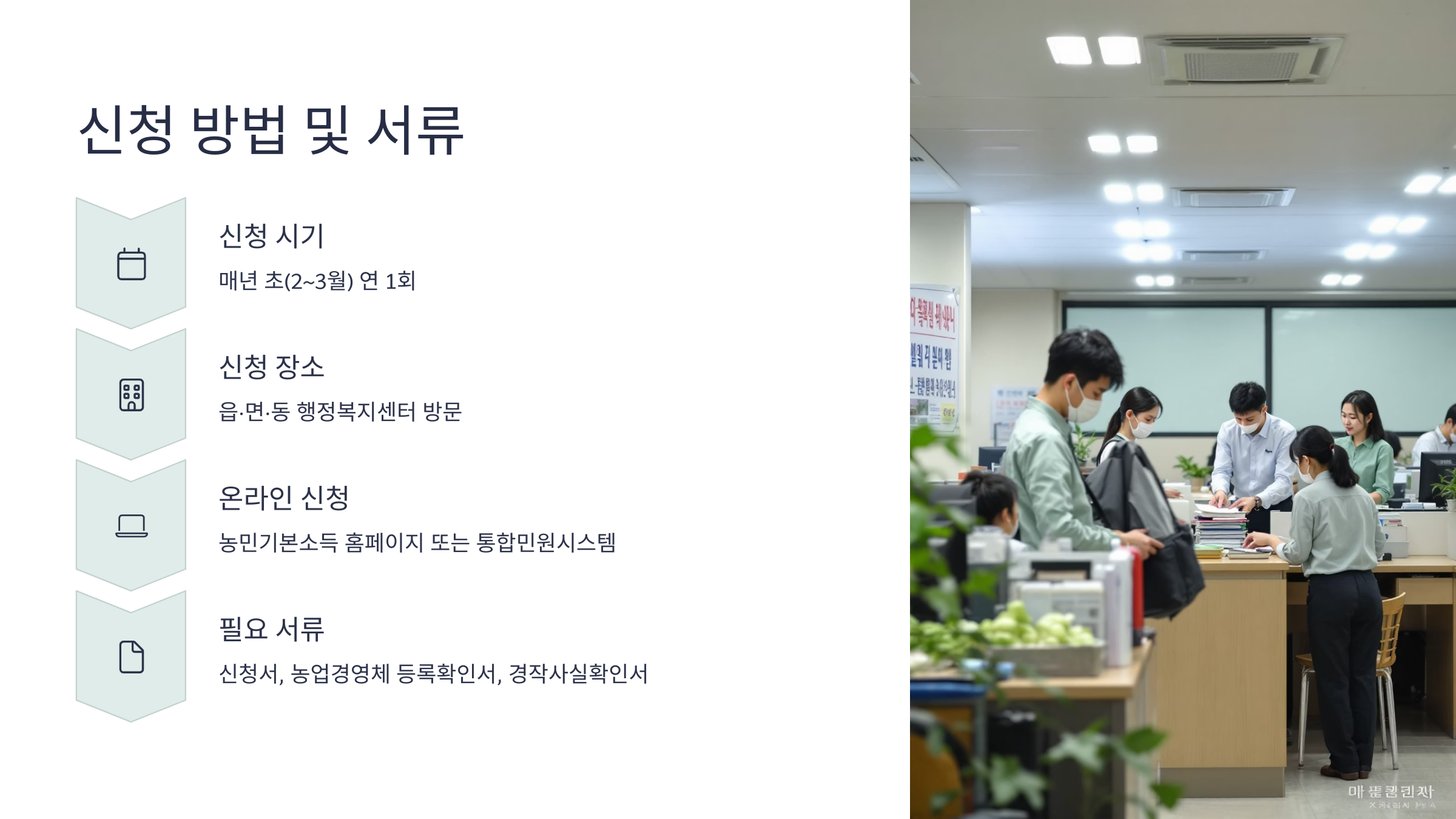경기도 농민기본소득 신청은 연 1회만 가능해요. 매년 초(2~3월 사이) 각 시·군에서 공고를 내고, 해당 기간 내에 읍·면·동 행정복지센터 방문 또는 온라인 접수가 가능해요.
