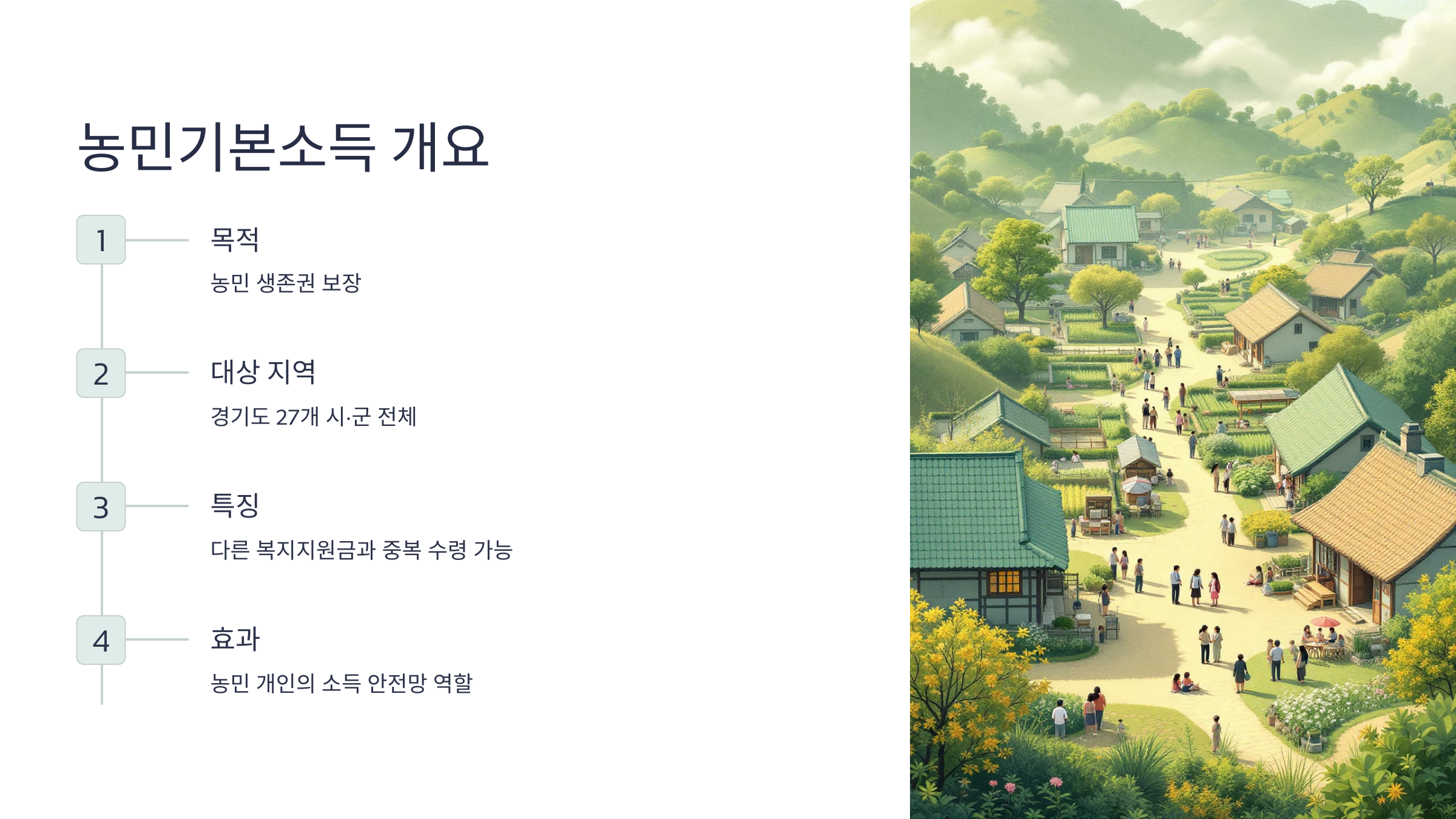 농민의 기본권 보장과 농촌지역 균형 발전을 위해 경기도는 전국 최초로 ‘농민기본소득’ 제도를 운영 중이에요. 기초생활수준 보장을 목표로 매년 일정 금액을 지역화폐로 지급하고 있어요.