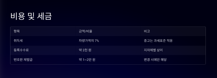 | 취득세 | 차량가액의 7% | 신차 기준, 중고는 과세표준 적용 |