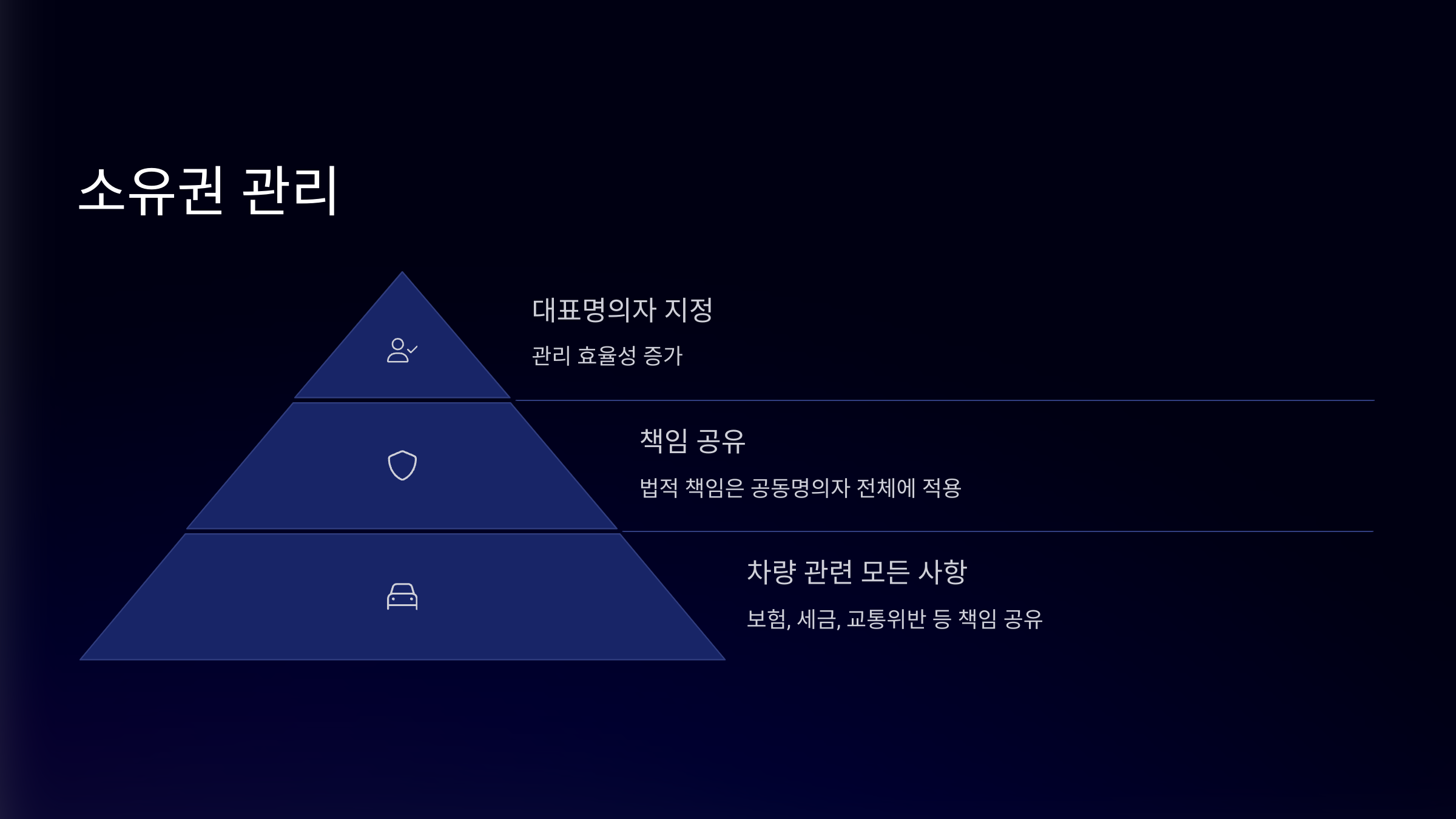 대표명의자 제도를 활용하면 보험 계약자 지정, 세금 고지 통지, 자동차세 납부 등의 실무는 1인이 전담할 수 있어 관리 효율성이 높아져요.