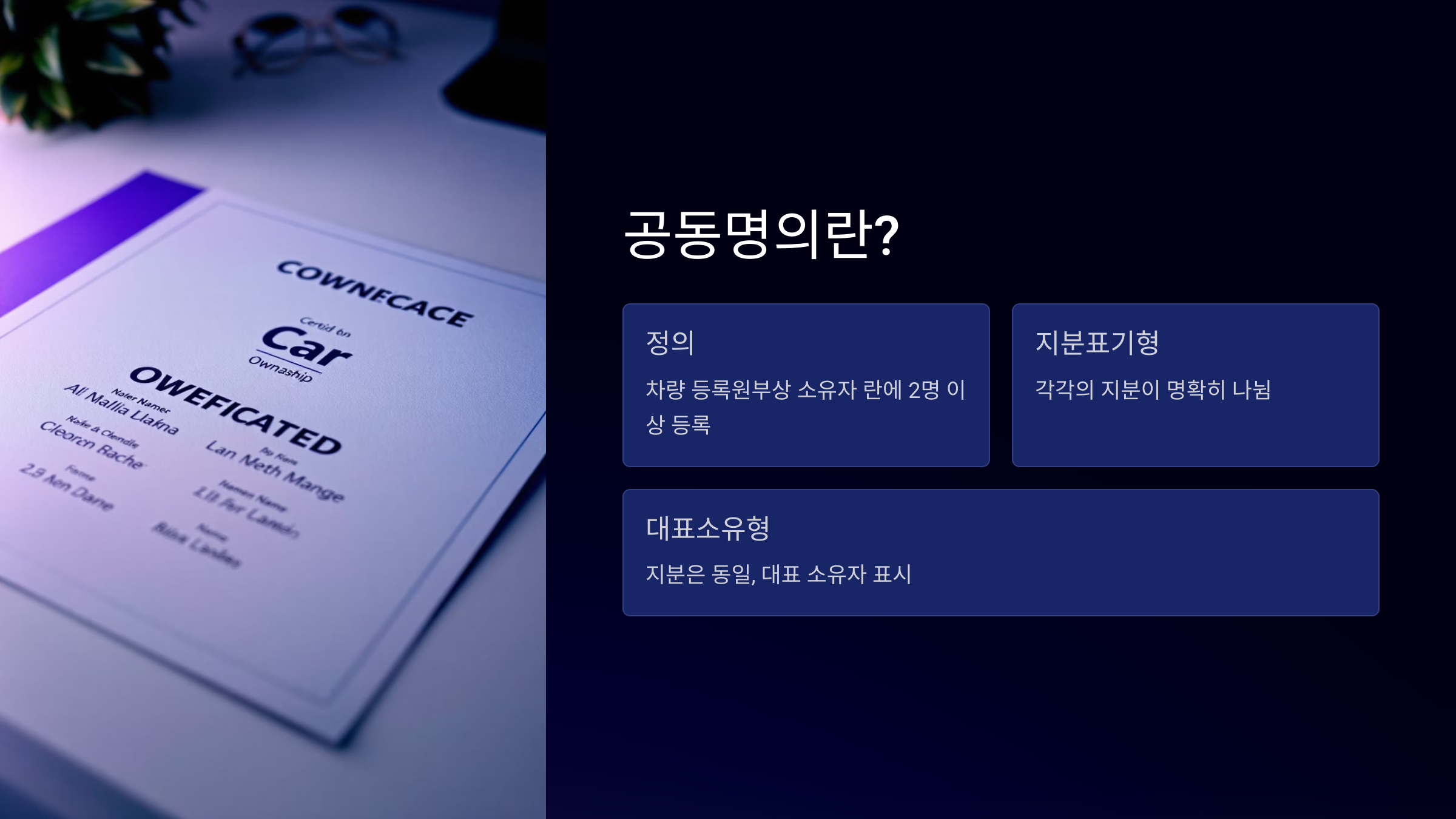 자동차 공동명의란 차량 등록원부상 소유자 란에 2명 이상의 명의자가 등록되는 걸 말해요. 주로 부부, 부모자식, 형제자매 또는 공동사업자 간에 등록이 많아요.
