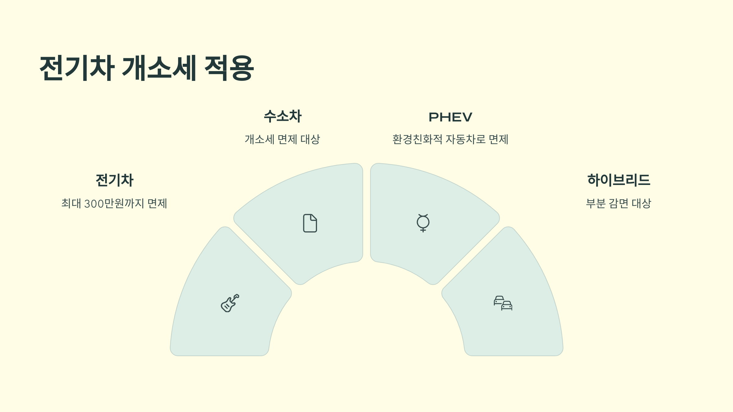 전기차, 수소차, 플러그인하이브리드(PHEV)는 환경친화적 자동차에 해당되기 때문에 대부분 개별소비세 면제 대상이에요.