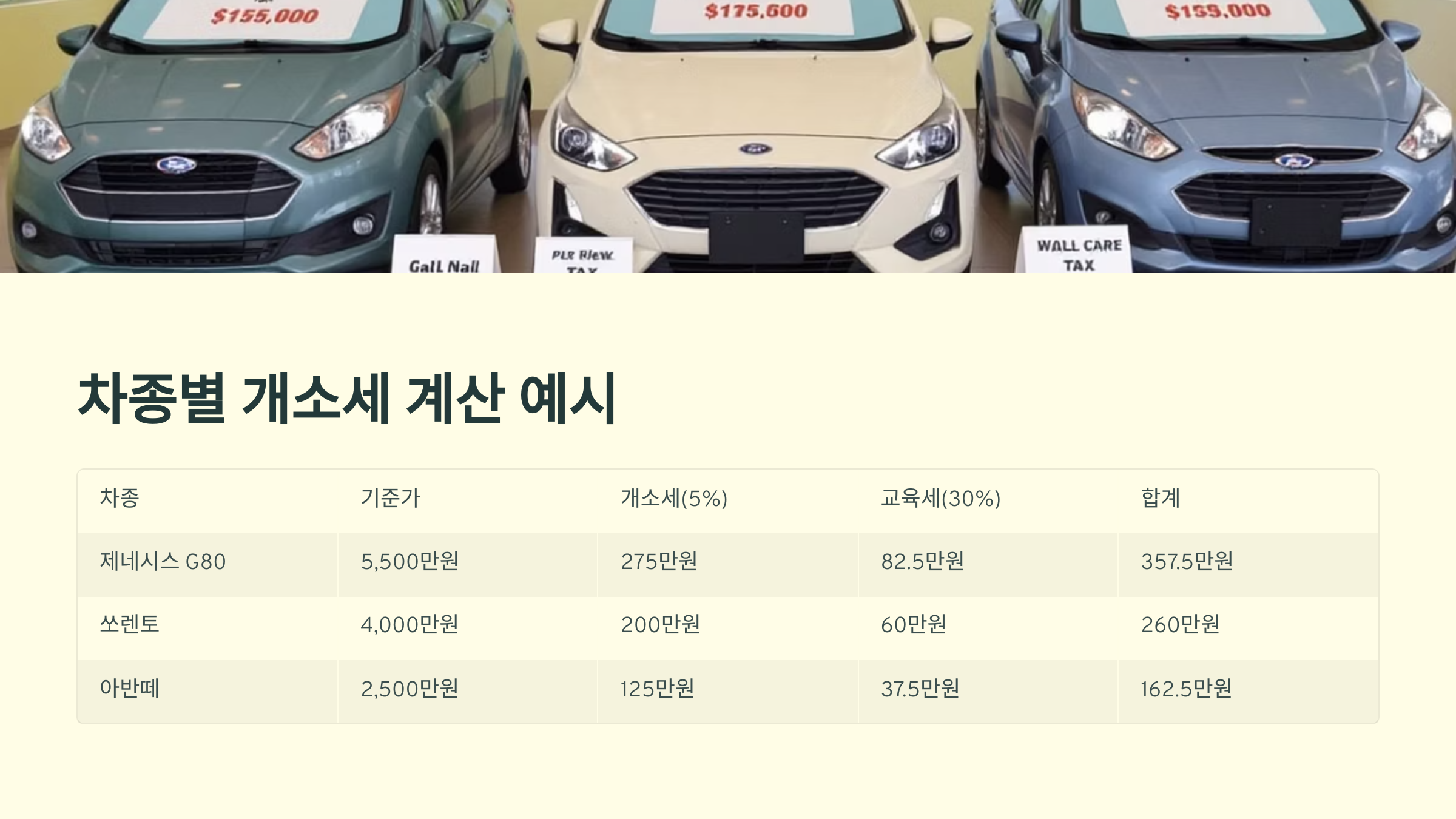예를 들어 차량 가격이 3,000만 원이라면 개소세만 약 150만 원, 교육세 45만 원, 부가세 약 319.5만 원이 추가로 붙어요. 즉, 실제 차량 실구매가는 3,500만 원 이상이 될 수 있는 셈이에요.