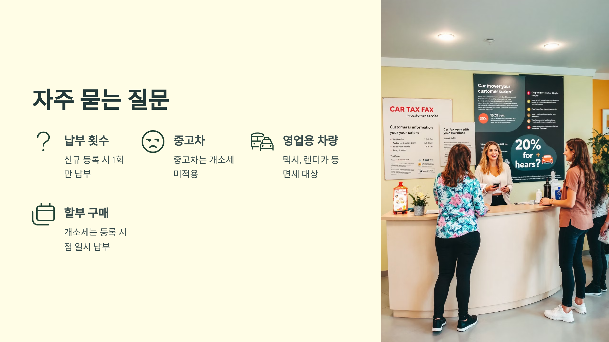 A1. 네. 차량 신규 등록 시 1회 납부하며, 이후 중고차 매매나 명의 이전에서는 과세되지 않아요.