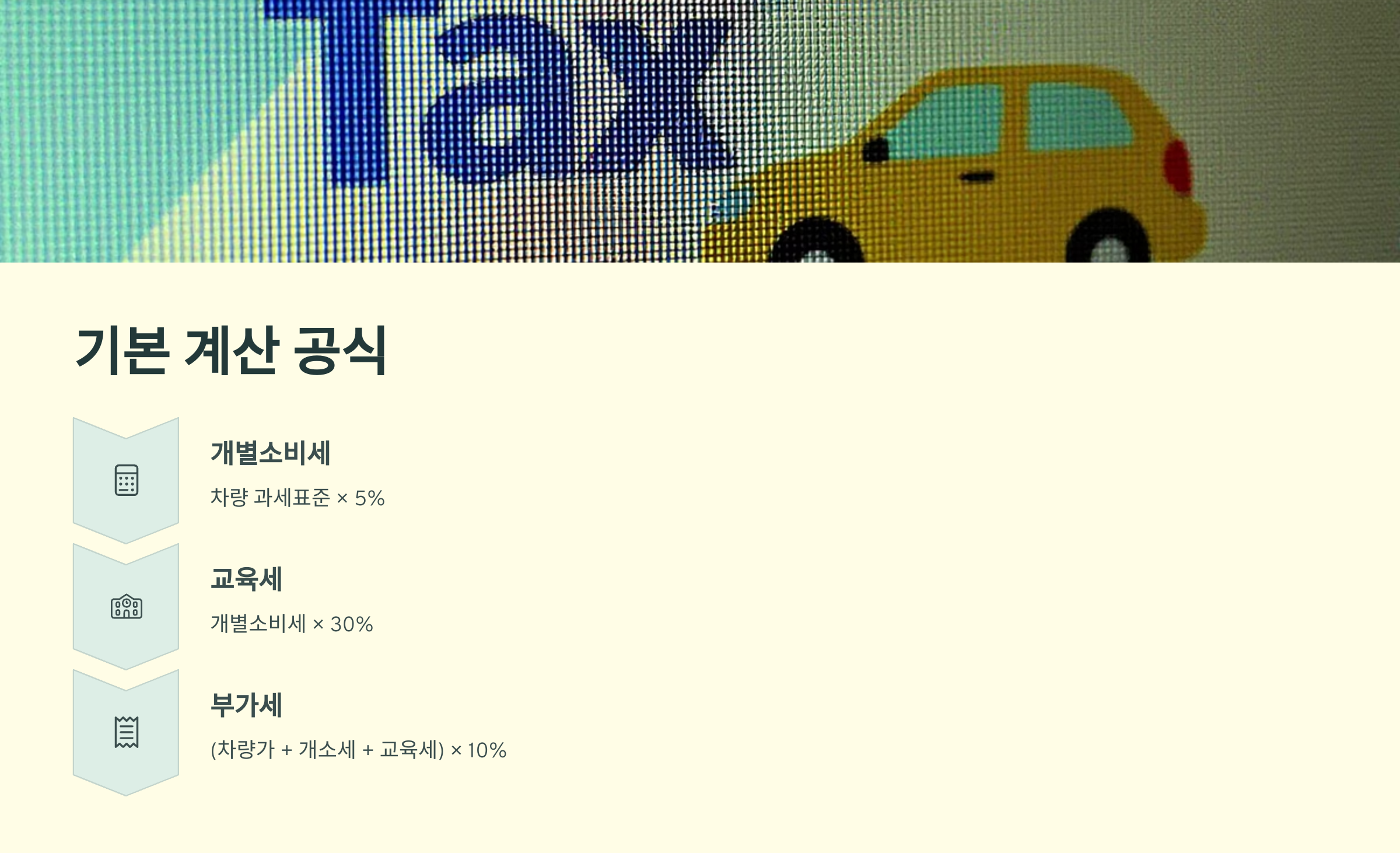 2025년 기준 개별소비세 기본 세율은 차량가격의 5%예요. 여기에 교육세 30%가 개소세에 추가되고, 최종 부가가치세(10%)까지 포함돼요.