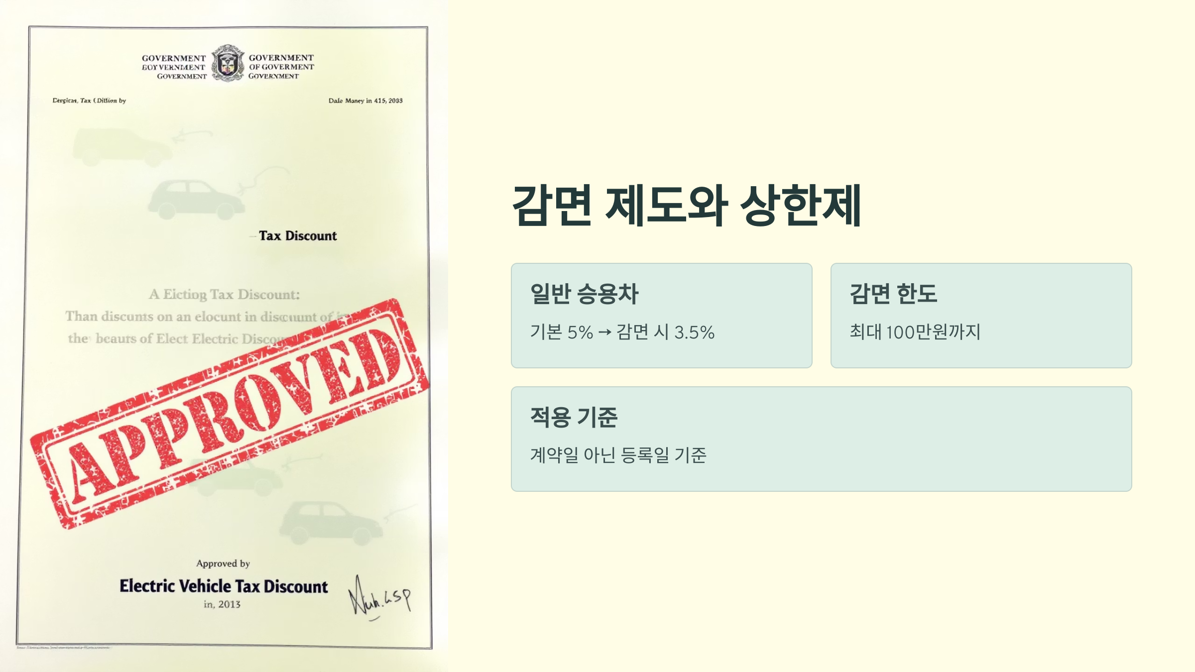 - 일반 승용차: 기본 5% → 감면 시 3.5% 적용 가능 (시기별 차이 있음)