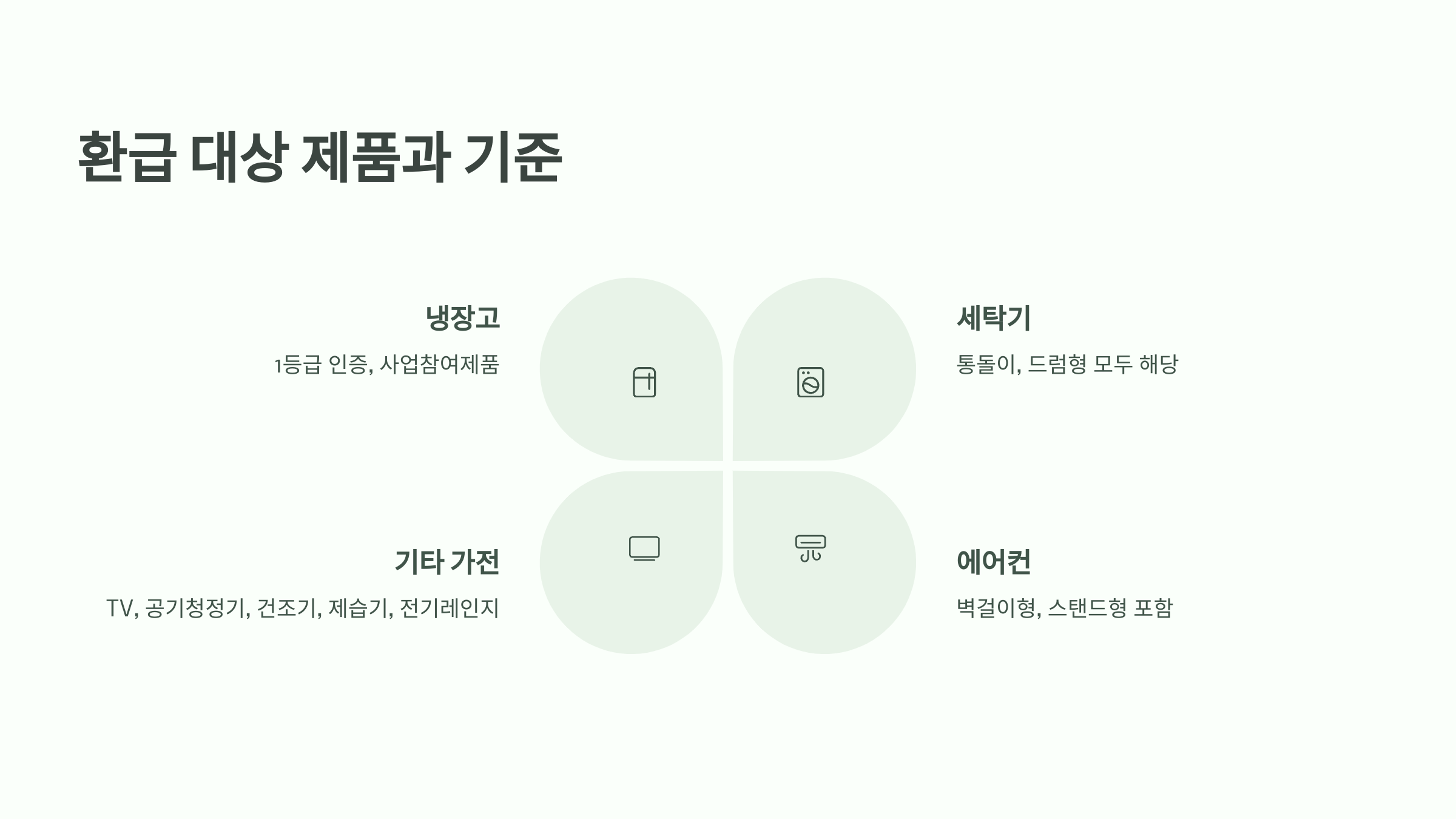 환급 대상 제품은 에너지소비효율 1등급을 획득한 가전제품이에요. 대표적으로 냉장고, 세탁기, 에어컨, 텔레비전, 공기청정기 등이 포함됩니다. 최근에는 건조기, 제습기, 전기레인지 등도 대상 품목에 추가됐어요.