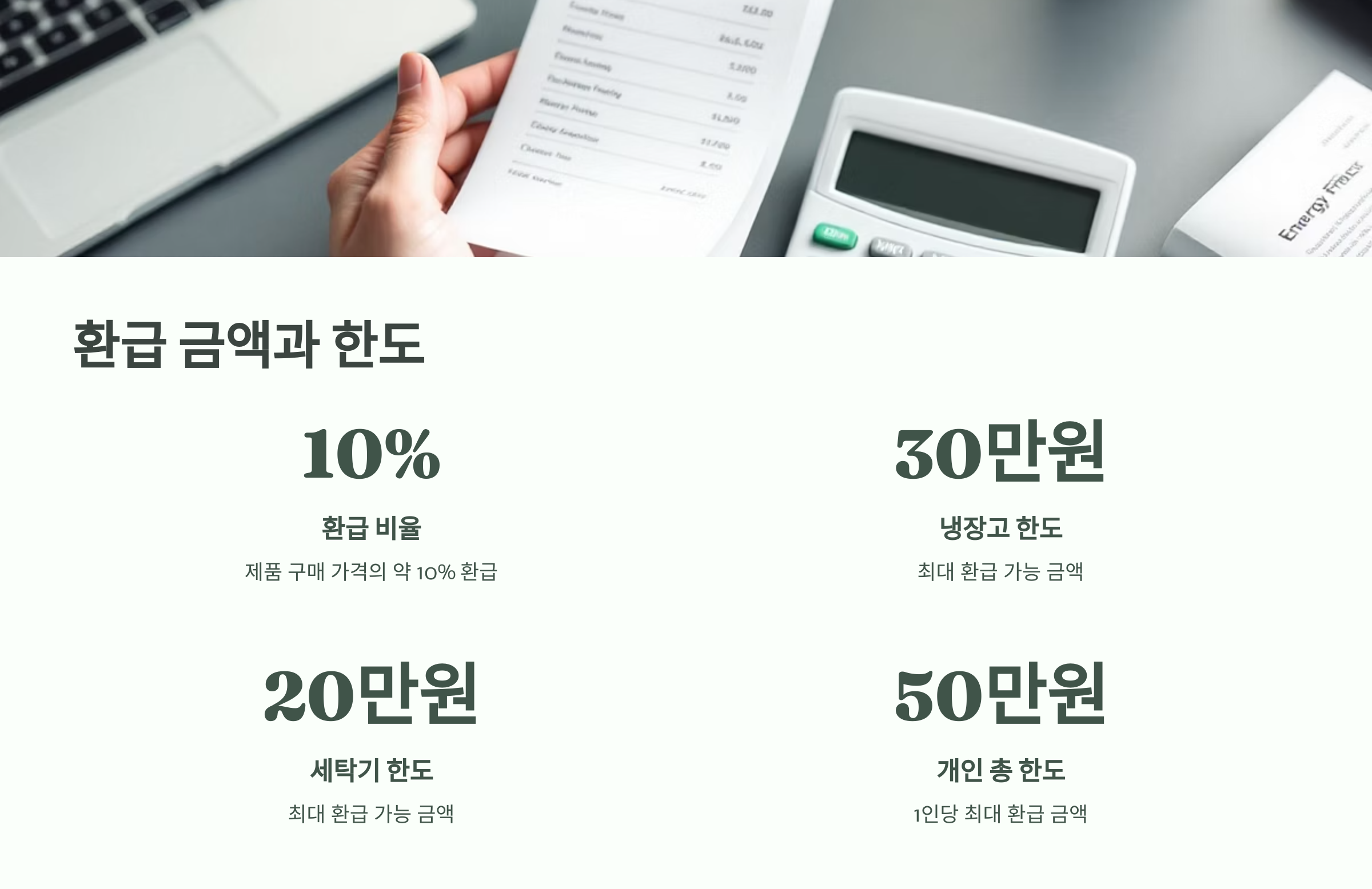 예를 들어, 냉장고는 최대 30만 원, 세탁기는 최대 20만 원까지 환급됩니다. 에어컨이나 건조기 등은 15만 원 수준의 한도를 가지고 있어요. 매년 정부 예산에 따라 세부 조정될 수 있습니다.