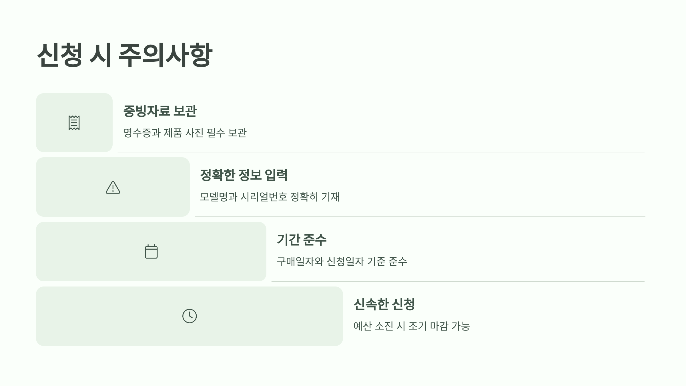 환급 신청을 위해서는 구매일자가 사업 공고 기간 내에 있어야 하고, 개인 구매(법인 및 단체 제외)이어야 해요. 또 제품 등록번호, 모델명 등이 정확히 일치해야 합니다.