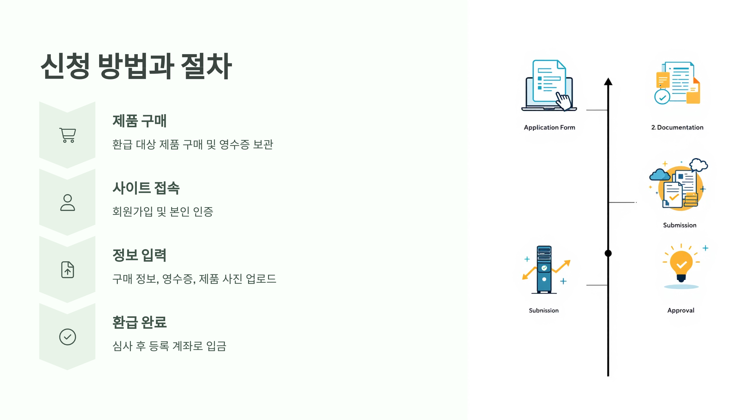 환급 신청 절차는 비교적 간단해요. 첫 번째, 환급 대상 제품을 구매한 후 영수증과 제품 인증서(에너지효율 등급 라벨)를 준비합니다.