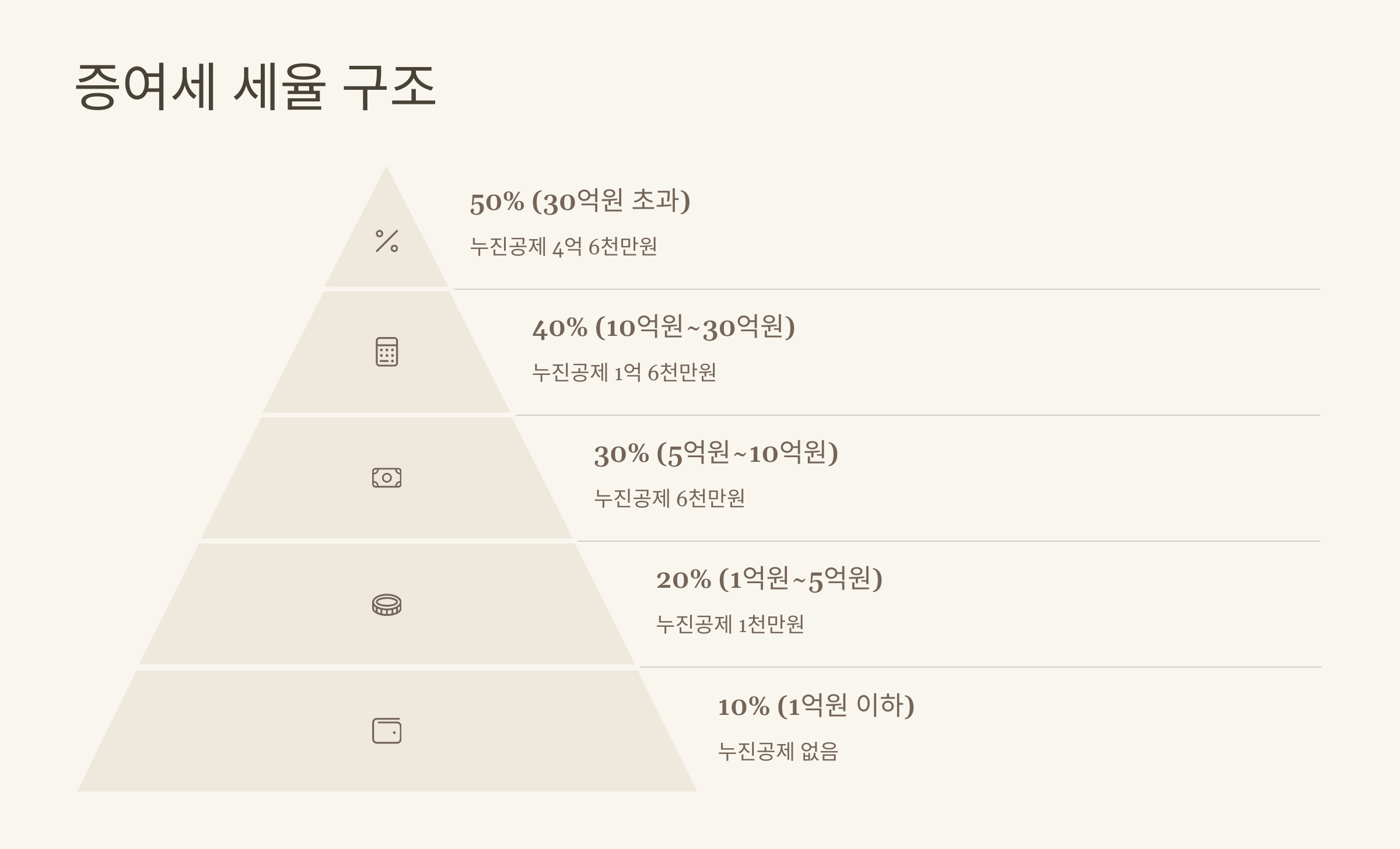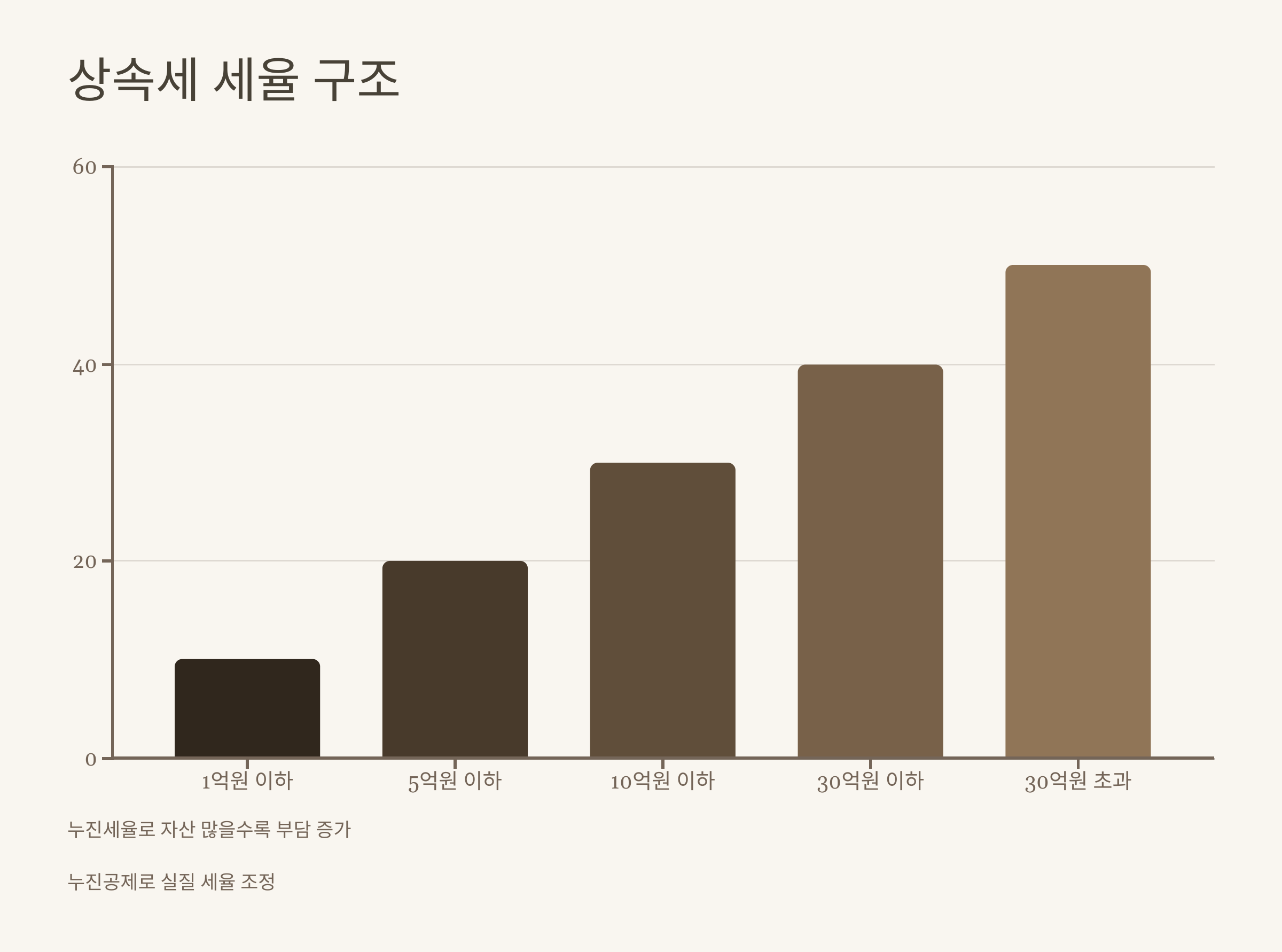 세율은 누진 구조로 10%부터 시작해서 최대 50%까지 올라가요. 예를 들어 1억 원을 초과하면 20%, 5억 원 초과분은 30% 세율이 적용돼요. 자산이 많을수록 누진세율 덕분에 세 부담이 급격히 커지죠.