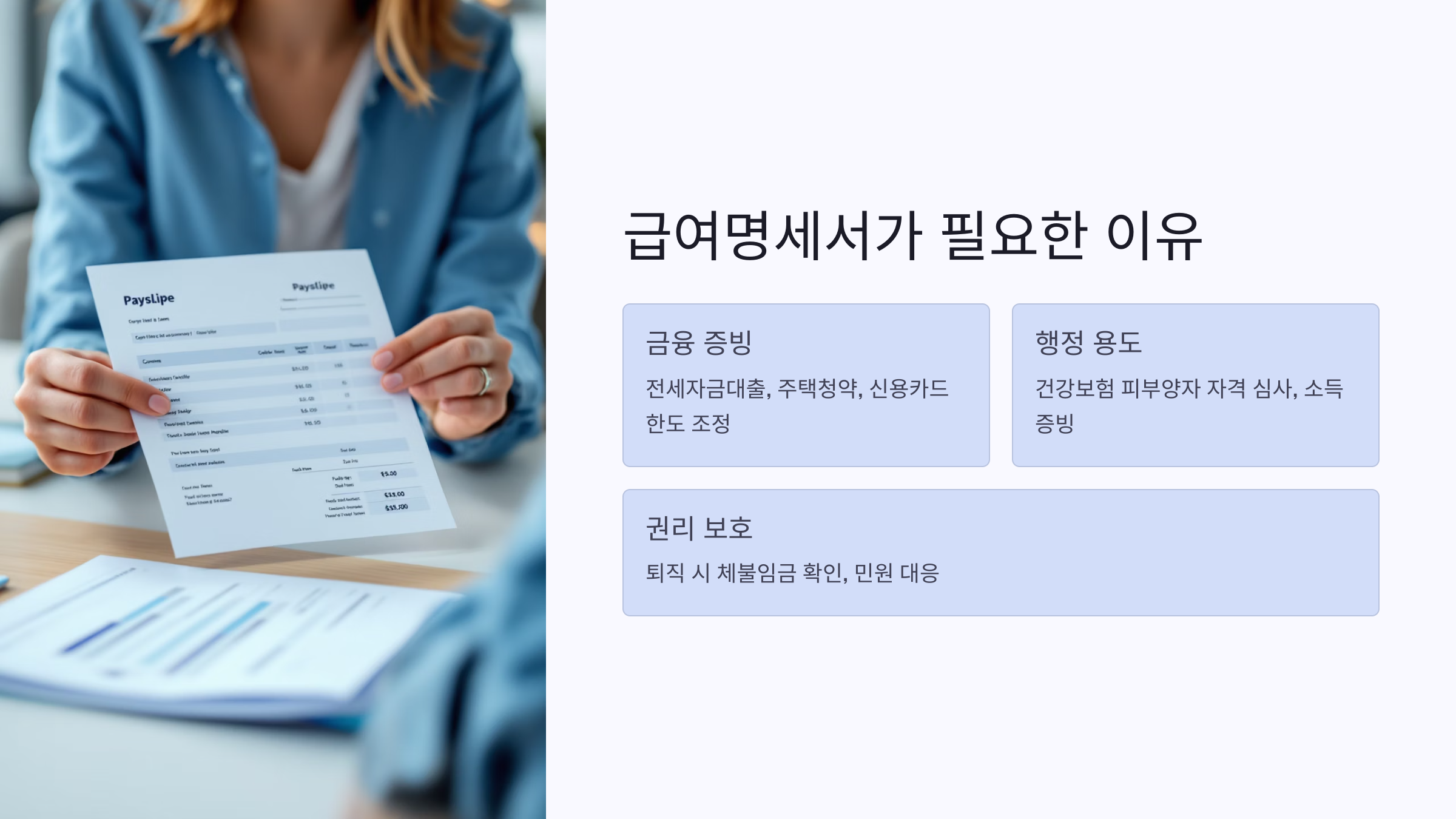 급여명세서는 단순히 월급 확인 용도만이 아니라, 다양한 행정·금융 상황에서 필요한 공식 문서로 사용됩니다.