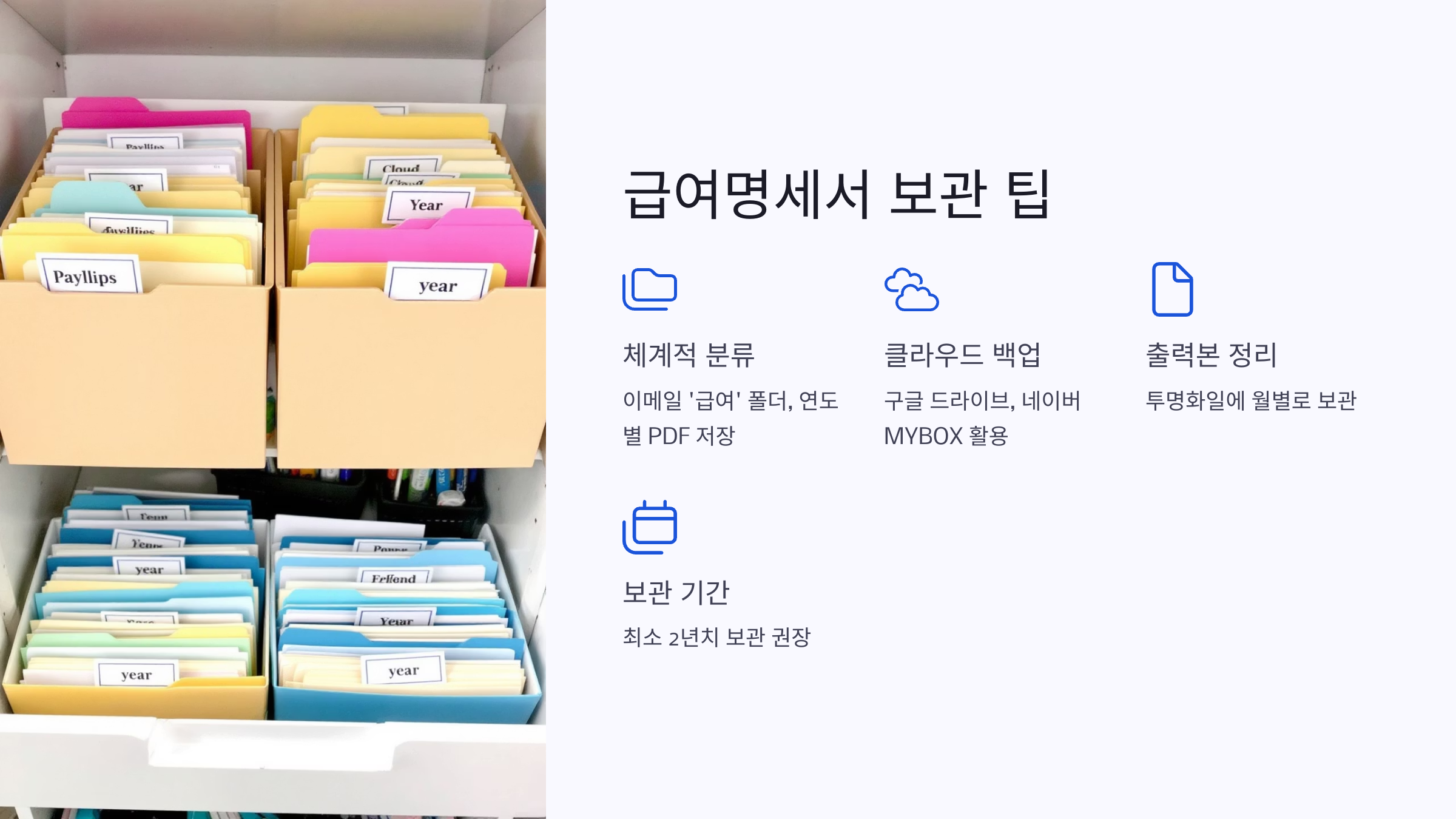 급여명세서는 1~2회 쓰고 버리는 문서가 아니에요. 여러 상황에서 반복적으로 필요하기 때문에 체계적으로 보관해두는 걸 추천해요.