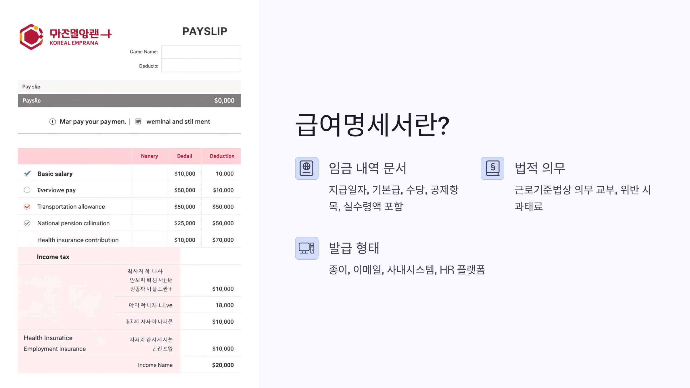 급여명세서는 근로자가 받은 임금의 내역을 구체적으로 기재한 문서예요. 지급 일자, 기본급, 각종 수당, 공제 항목, 실수령액 등이 모두 포함되어 있죠.